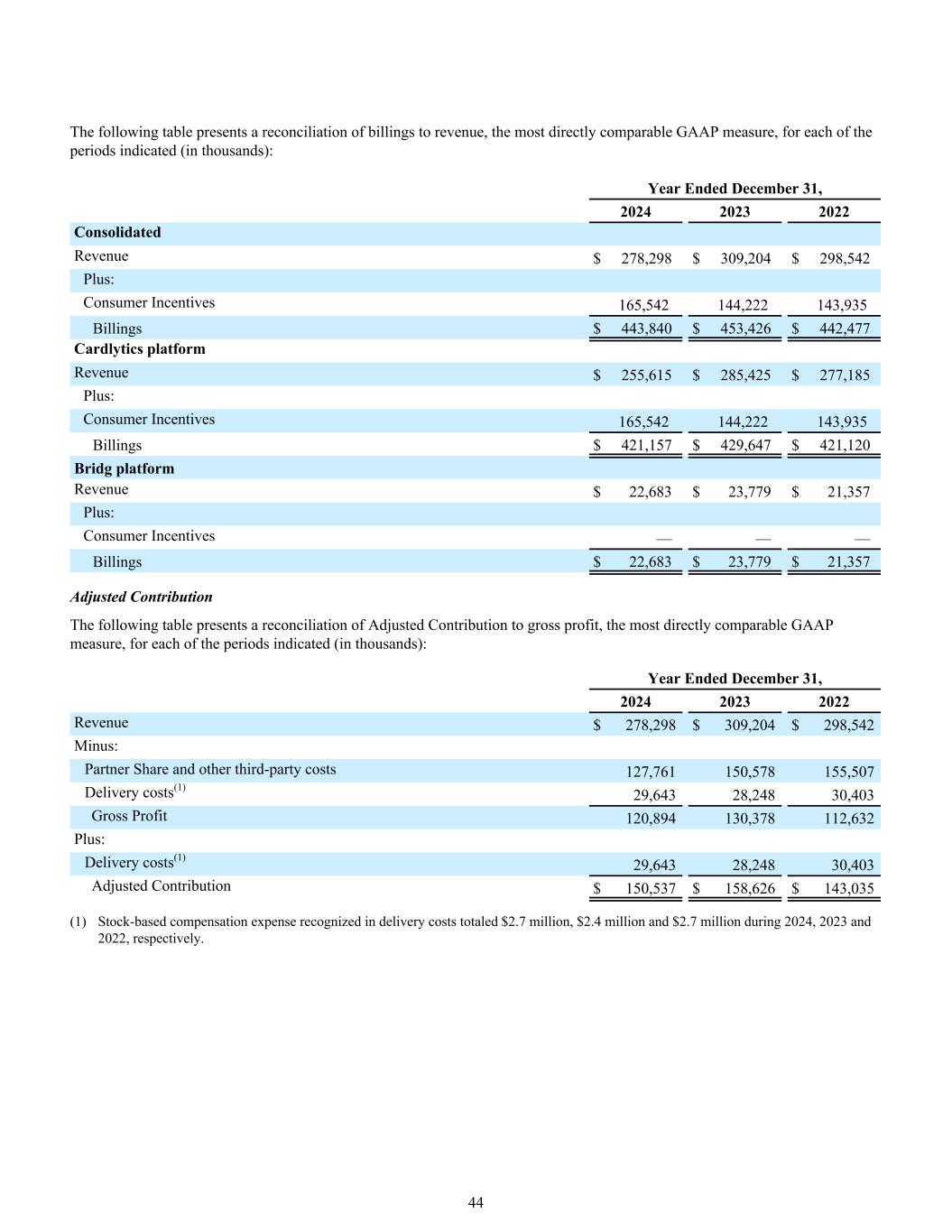 The following table presents a reconciliation of billings to revenue, the most directly comparable GAAP measure, for each of the periods indicated (in thousands): Year Ended December 31, 2024 2023 2022 Consolidated Revenue $ 278,298 $ 309,204 $ 298,542 Plus: Consumer Incentives 165,542 144,222 143,935 Billings $ 443,840 $ 453,426 $ 442,477 Cardlytics platform Revenue $ 255,615 $ 285,425 $ 277,185 Plus: Consumer Incentives 165,542 144,222 143,935 Billings $ 421,157 $ 429,647 $ 421,120 Bridg platform Revenue $ 22,683 $ 23,779 $ 21,357 Plus: Consumer Incentives — — — Billings $ 22,683 $ 23,779 $ 21,357 Adjusted Contribution The following table presents a reconciliation of Adjusted Contribution to gross profit, the most directly comparable GAAP measure, for each of the periods indicated (in thousands): Year Ended December 31, 2024 2023 2022 Revenue $ 278,298 $ 309,204 $ 298,542 Minus: Partner Share and other third-party costs 127,761 150,578 155,507 Delivery costs(1) 29,643 28,248 30,403 Gross Profit 120,894 130,378 112,632 Plus: Delivery costs(1) 29,643 28,248 30,403 Adjusted Contribution $ 150,537 $ 158,626 $ 143,035 (1) Stock-based compensation expense recognized in delivery costs totaled $2.7 million, $2.4 million and $2.7 million during 2024, 2023 and 2022, respectively. 44