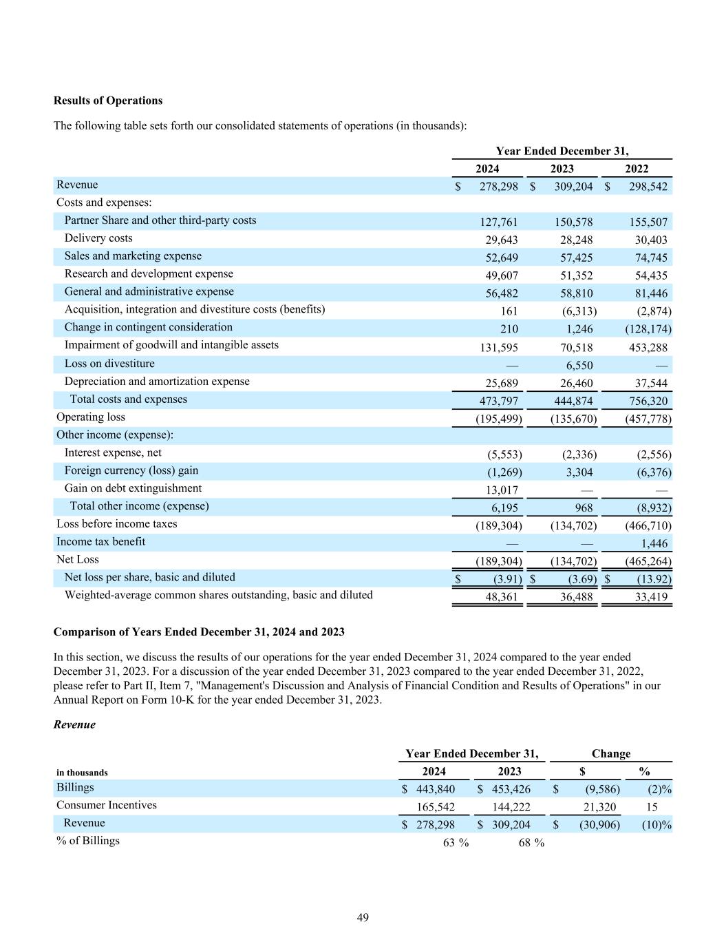 Results of Operations The following table sets forth our consolidated statements of operations (in thousands): Year Ended December 31, 2024 2023 2022 Revenue $ 278,298 $ 309,204 $ 298,542 Costs and expenses: Partner Share and other third-party costs 127,761 150,578 155,507 Delivery costs 29,643 28,248 30,403 Sales and marketing expense 52,649 57,425 74,745 Research and development expense 49,607 51,352 54,435 General and administrative expense 56,482 58,810 81,446 Acquisition, integration and divestiture costs (benefits) 161 (6,313) (2,874) Change in contingent consideration 210 1,246 (128,174) Impairment of goodwill and intangible assets 131,595 70,518 453,288 Loss on divestiture — 6,550 — Depreciation and amortization expense 25,689 26,460 37,544 Total costs and expenses 473,797 444,874 756,320 Operating loss (195,499) (135,670) (457,778) Other income (expense): Interest expense, net (5,553) (2,336) (2,556) Foreign currency (loss) gain (1,269) 3,304 (6,376) Gain on debt extinguishment 13,017 — — Total other income (expense) 6,195 968 (8,932) Loss before income taxes (189,304) (134,702) (466,710) Income tax benefit — — 1,446 Net Loss (189,304) (134,702) (465,264) Net loss per share, basic and diluted $ (3.91) $ (3.69) $ (13.92) Weighted-average common shares outstanding, basic and diluted 48,361 36,488 33,419 Comparison of Years Ended December 31, 2024 and 2023 In this section, we discuss the results of our operations for the year ended December 31, 2024 compared to the year ended December 31, 2023. For a discussion of the year ended December 31, 2023 compared to the year ended December 31, 2022, please refer to Part II, Item 7, "Management's Discussion and Analysis of Financial Condition and Results of Operations" in our Annual Report on Form 10-K for the year ended December 31, 2023. Revenue Year Ended December 31, Change in thousands 2024 2023 $ % Billings $ 443,840 $ 453,426 $ (9,586) (2) % Consumer Incentives 165,542 144,222 21,320 15 Revenue $ 278,298 $ 309,204 $ (30,906) (10) % % of Billings 63 % 68 % 49