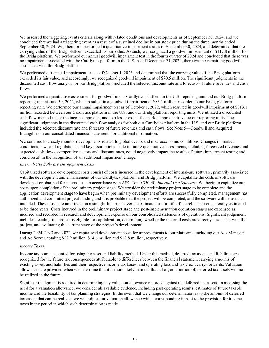 We assessed the triggering events criteria along with related conditions and developments as of September 30, 2024, and we concluded that we had a triggering event as a result of a sustained decline in our stock price during the three months ended September 30, 2024. We, therefore, performed a quantitative impairment test as of September 30, 2024, and determined that the carrying value of the Bridg platform exceeded its fair value. As such, we recognized a goodwill impairment of $117.8 million for the Bridg platform. We performed our annual goodwill impairment test in the fourth quarter of 2024 and concluded that there was no impairment associated with the Cardlytics platform in the U.S. As of December 31, 2024, there was no remaining goodwill associated with the Bridg platform. We performed our annual impairment test as of October 1, 2023 and determined that the carrying value of the Bridg platform exceeded its fair value, and accordingly, we recognized goodwill impairment of $70.5 million. The significant judgments in the discounted cash flow analysis for our Bridg platform included the selected discount rate and forecasts of future revenues and cash flows We performed a quantitative assessment for goodwill in our Cardlytics platform in the U.S. reporting unit and our Bridg platform reporting unit at June 30, 2022, which resulted in a goodwill impairment of $83.1 million recorded to our Bridg platform reporting unit. We performed our annual impairment test as of October 1, 2022, which resulted in goodwill impairment of $313.1 million recorded between our Cardlytics platform in the U.S. and our Bridg platform reporting units. We utilized a discounted cash flow method under the income approach, and to a lesser extent the market approach to value our reporting units. The significant judgments in the discounted cash flow analysis for both our Cardlytics platform in the U.S. and our Bridg platform included the selected discount rate and forecasts of future revenues and cash flows. See Note 5—Goodwill and Acquired Intangibles in our consolidated financial statements for additional information. We continue to closely monitor developments related to global events and macroeconomic conditions. Changes in market conditions, laws and regulations, and key assumptions made in future quantitative assessments, including forecasted revenues and expected cash flows, competitive factors and discount rates, could negatively impact the results of future impairment testing and could result in the recognition of an additional impairment charge. Internal-Use Software Development Costs Capitalized software development costs consist of costs incurred in the development of internal-use software, primarily associated with the development and enhancement of our Cardlytics platform and Bridg platform. We capitalize the costs of software developed or obtained for internal use in accordance with ASC Topic 350-40, Internal Use Software. We begin to capitalize our costs upon completion of the preliminary project stage. We consider the preliminary project stage to be complete and the application development stage to have begun when preliminary development efforts are successfully completed, management has authorized and committed project funding and it is probable that the project will be completed, and the software will be used as intended. These costs are amortized on a straight-line basis over the estimated useful life of the related asset, generally estimated to be three years. Costs incurred in the preliminary project stage and post-implementation operation stages are expensed as incurred and recorded in research and development expense on our consolidated statements of operations. Significant judgement includes deciding if a project is eligible for capitalization, determining whether the incurred costs are directly associated with the project, and evaluating the current stage of the project’s development. During 2024, 2023 and 2022, we capitalized development costs for improvements to our platforms, including our Ads Manager and Ad Server, totaling $22.9 million, $14.6 million and $12.8 million, respectively. Income Taxes Income taxes are accounted for using the asset and liability method. Under this method, deferred tax assets and liabilities are recognized for the future tax consequences attributable to differences between the financial statement carrying amounts of existing assets and liabilities and their respective income tax bases, and operating loss and tax credit carry-forwards. Valuation allowances are provided when we determine that it is more likely than not that all of, or a portion of, deferred tax assets will not be utilized in the future. Significant judgment is required in determining any valuation allowance recorded against net deferred tax assets. In assessing the need for a valuation allowance, we consider all available evidence, including past operating results, estimates of future taxable income and the feasibility of tax planning strategies. In the event that we change our determination as to the amount of deferred tax assets that can be realized, we will adjust our valuation allowance with a corresponding impact to the provision for income taxes in the period in which such determination is made. 59