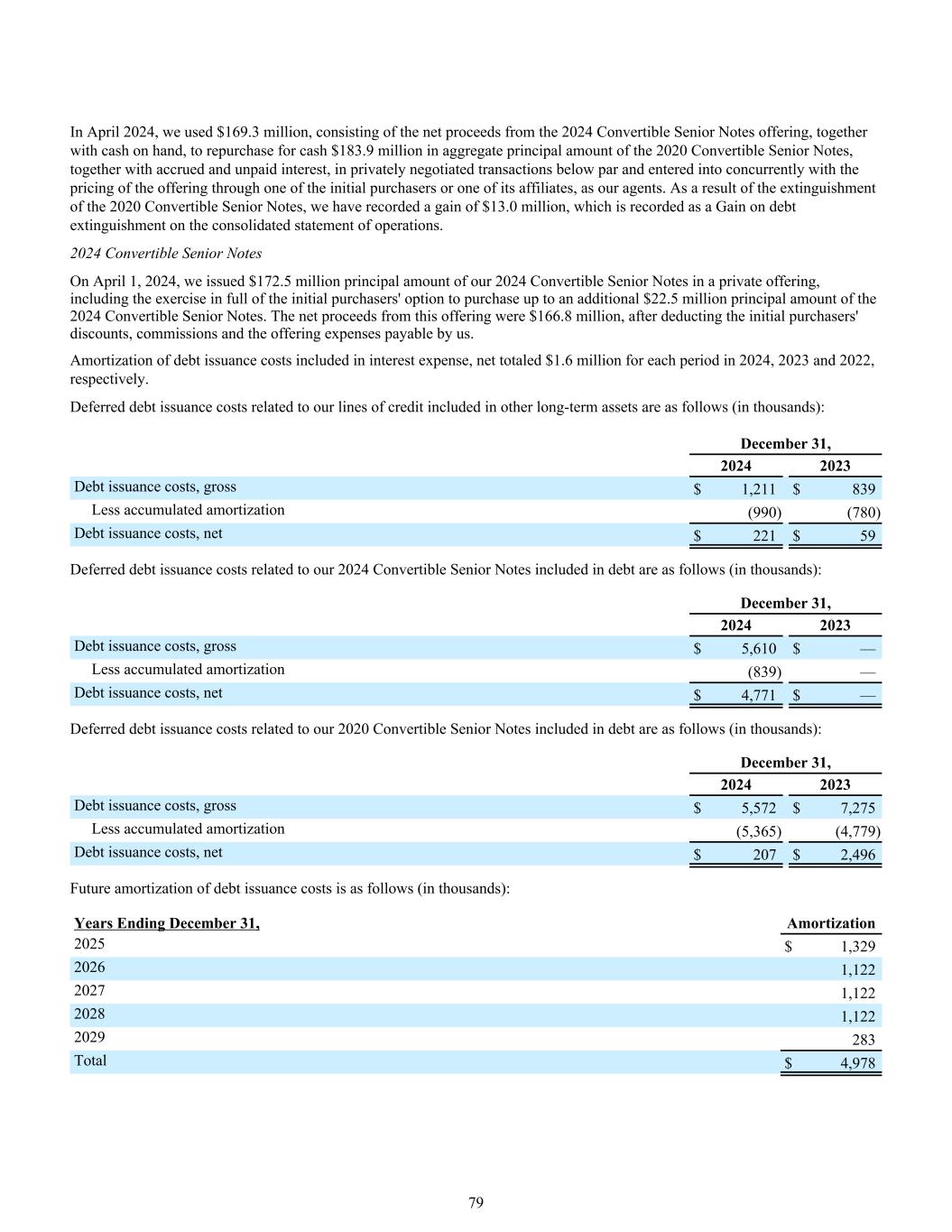 In April 2024, we used $169.3 million, consisting of the net proceeds from the 2024 Convertible Senior Notes offering, together with cash on hand, to repurchase for cash $183.9 million in aggregate principal amount of the 2020 Convertible Senior Notes, together with accrued and unpaid interest, in privately negotiated transactions below par and entered into concurrently with the pricing of the offering through one of the initial purchasers or one of its affiliates, as our agents. As a result of the extinguishment of the 2020 Convertible Senior Notes, we have recorded a gain of $13.0 million, which is recorded as a Gain on debt extinguishment on the consolidated statement of operations. 2024 Convertible Senior Notes On April 1, 2024, we issued $172.5 million principal amount of our 2024 Convertible Senior Notes in a private offering, including the exercise in full of the initial purchasers' option to purchase up to an additional $22.5 million principal amount of the 2024 Convertible Senior Notes. The net proceeds from this offering were $166.8 million, after deducting the initial purchasers' discounts, commissions and the offering expenses payable by us. Amortization of debt issuance costs included in interest expense, net totaled $1.6 million for each period in 2024, 2023 and 2022, respectively. Deferred debt issuance costs related to our lines of credit included in other long-term assets are as follows (in thousands): December 31, 2024 2023 Debt issuance costs, gross $ 1,211 $ 839 Less accumulated amortization (990) (780) Debt issuance costs, net $ 221 $ 59 Deferred debt issuance costs related to our 2024 Convertible Senior Notes included in debt are as follows (in thousands): December 31, 2024 2023 Debt issuance costs, gross $ 5,610 $ — Less accumulated amortization (839) — Debt issuance costs, net $ 4,771 $ — Deferred debt issuance costs related to our 2020 Convertible Senior Notes included in debt are as follows (in thousands): December 31, 2024 2023 Debt issuance costs, gross $ 5,572 $ 7,275 Less accumulated amortization (5,365) (4,779) Debt issuance costs, net $ 207 $ 2,496 Future amortization of debt issuance costs is as follows (in thousands): Years Ending December 31, Amortization 2025 $ 1,329 2026 1,122 2027 1,122 2028 1,122 2029 283 Total $ 4,978 79