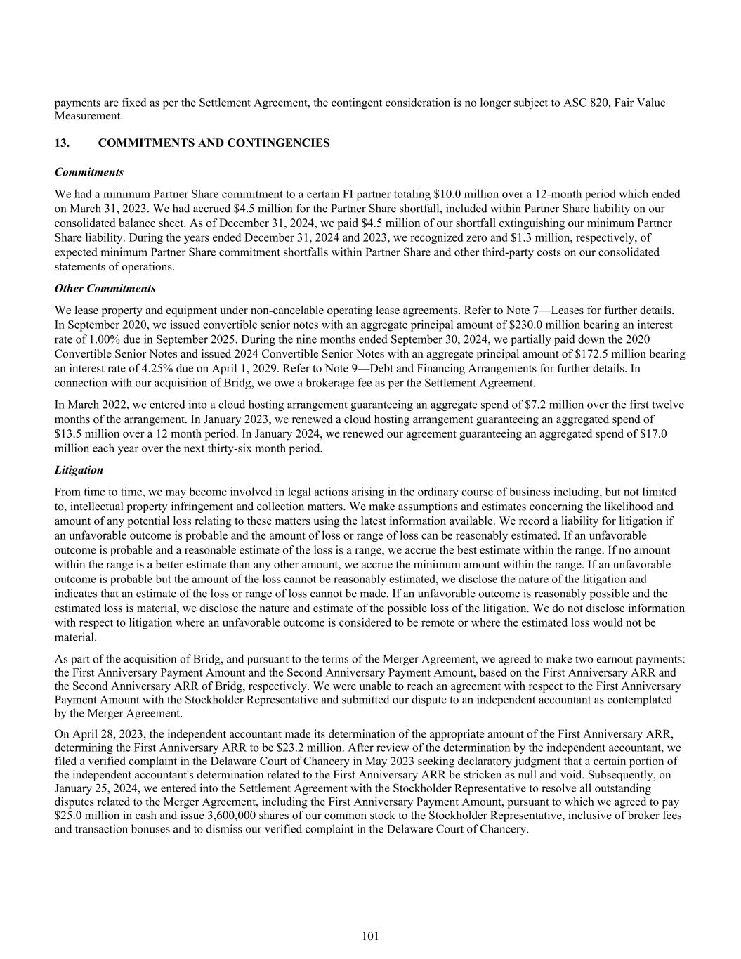 payments are fixed as per the Settlement Agreement, the contingent consideration is no longer subject to ASC 820, Fair Value Measurement. 13. COMMITMENTS AND CONTINGENCIES Commitments We had a minimum Partner Share commitment to a certain FI partner totaling $10.0 million over a 12-month period which ended on March 31, 2023. We had accrued $4.5 million for the Partner Share shortfall, included within Partner Share liability on our consolidated balance sheet. As of December 31, 2024, we paid $4.5 million of our shortfall extinguishing our minimum Partner Share liability. During the years ended December 31, 2024 and 2023, we recognized zero and $1.3 million, respectively, of expected minimum Partner Share commitment shortfalls within Partner Share and other third-party costs on our consolidated statements of operations. Other Commitments We lease property and equipment under non-cancelable operating lease agreements. Refer to Note 7—Leases for further details. In September 2020, we issued convertible senior notes with an aggregate principal amount of $230.0 million bearing an interest rate of 1.00% due in September 2025. During the nine months ended September 30, 2024, we partially paid down the 2020 Convertible Senior Notes and issued 2024 Convertible Senior Notes with an aggregate principal amount of $172.5 million bearing an interest rate of 4.25% due on April 1, 2029. Refer to Note 9—Debt and Financing Arrangements for further details. In connection with our acquisition of Bridg, we owe a brokerage fee as per the Settlement Agreement. In March 2022, we entered into a cloud hosting arrangement guaranteeing an aggregate spend of $7.2 million over the first twelve months of the arrangement. In January 2023, we renewed a cloud hosting arrangement guaranteeing an aggregated spend of $13.5 million over a 12 month period. In January 2024, we renewed our agreement guaranteeing an aggregated spend of $17.0 million each year over the next thirty-six month period. Litigation From time to time, we may become involved in legal actions arising in the ordinary course of business including, but not limited to, intellectual property infringement and collection matters. We make assumptions and estimates concerning the likelihood and amount of any potential loss relating to these matters using the latest information available. We record a liability for litigation if an unfavorable outcome is probable and the amount of loss or range of loss can be reasonably estimated. If an unfavorable outcome is probable and a reasonable estimate of the loss is a range, we accrue the best estimate within the range. If no amount within the range is a better estimate than any other amount, we accrue the minimum amount within the range. If an unfavorable outcome is probable but the amount of the loss cannot be reasonably estimated, we disclose the nature of the litigation and indicates that an estimate of the loss or range of loss cannot be made. If an unfavorable outcome is reasonably possible and the estimated loss is material, we disclose the nature and estimate of the possible loss of the litigation. We do not disclose information with respect to litigation where an unfavorable outcome is considered to be remote or where the estimated loss would not be material. As part of the acquisition of Bridg, and pursuant to the terms of the Merger Agreement, we agreed to make two earnout payments: the First Anniversary Payment Amount and the Second Anniversary Payment Amount, based on the First Anniversary ARR and the Second Anniversary ARR of Bridg, respectively. We were unable to reach an agreement with respect to the First Anniversary Payment Amount with the Stockholder Representative and submitted our dispute to an independent accountant as contemplated by the Merger Agreement. On April 28, 2023, the independent accountant made its determination of the appropriate amount of the First Anniversary ARR, determining the First Anniversary ARR to be $23.2 million. After review of the determination by the independent accountant, we filed a verified complaint in the Delaware Court of Chancery in May 2023 seeking declaratory judgment that a certain portion of the independent accountant's determination related to the First Anniversary ARR be stricken as null and void. Subsequently, on January 25, 2024, we entered into the Settlement Agreement with the Stockholder Representative to resolve all outstanding disputes related to the Merger Agreement, including the First Anniversary Payment Amount, pursuant to which we agreed to pay $25.0 million in cash and issue 3,600,000 shares of our common stock to the Stockholder Representative, inclusive of broker fees and transaction bonuses and to dismiss our verified complaint in the Delaware Court of Chancery. 101