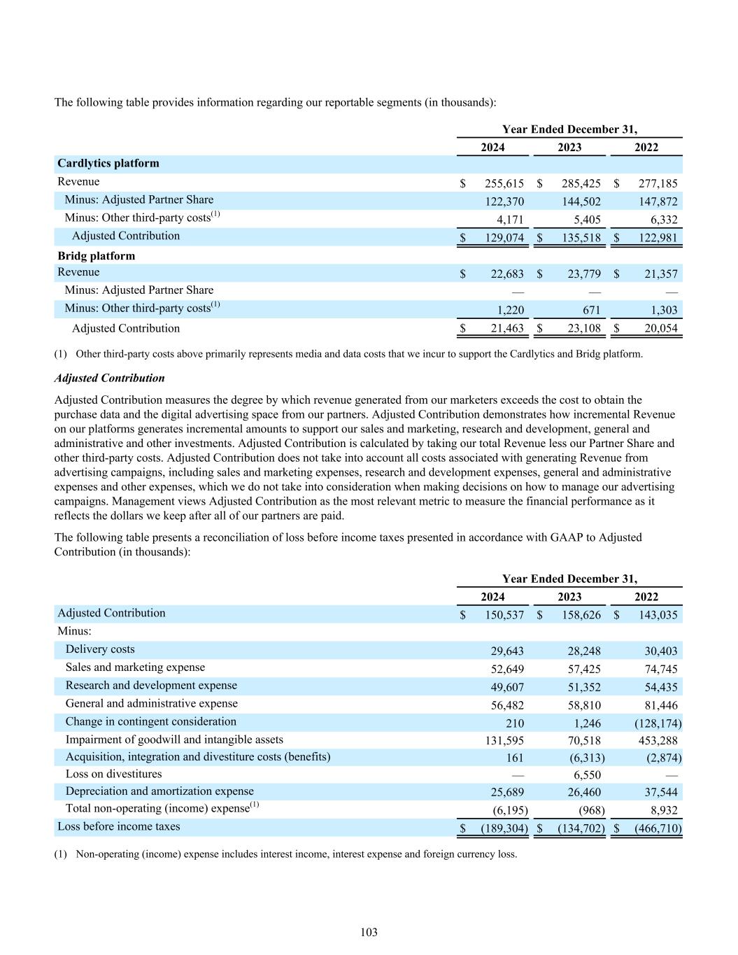 The following table provides information regarding our reportable segments (in thousands): Year Ended December 31, 2024 2023 2022 Cardlytics platform Revenue $ 255,615 $ 285,425 $ 277,185 Minus: Adjusted Partner Share 122,370 144,502 147,872 Minus: Other third-party costs(1) 4,171 5,405 6,332 Adjusted Contribution $ 129,074 $ 135,518 $ 122,981 Bridg platform Revenue $ 22,683 $ 23,779 $ 21,357 Minus: Adjusted Partner Share — — — Minus: Other third-party costs(1) 1,220 671 1,303 Adjusted Contribution $ 21,463 $ 23,108 $ 20,054 (1) Other third-party costs above primarily represents media and data costs that we incur to support the Cardlytics and Bridg platform. Adjusted Contribution Adjusted Contribution measures the degree by which revenue generated from our marketers exceeds the cost to obtain the purchase data and the digital advertising space from our partners. Adjusted Contribution demonstrates how incremental Revenue on our platforms generates incremental amounts to support our sales and marketing, research and development, general and administrative and other investments. Adjusted Contribution is calculated by taking our total Revenue less our Partner Share and other third-party costs. Adjusted Contribution does not take into account all costs associated with generating Revenue from advertising campaigns, including sales and marketing expenses, research and development expenses, general and administrative expenses and other expenses, which we do not take into consideration when making decisions on how to manage our advertising campaigns. Management views Adjusted Contribution as the most relevant metric to measure the financial performance as it reflects the dollars we keep after all of our partners are paid. The following table presents a reconciliation of loss before income taxes presented in accordance with GAAP to Adjusted Contribution (in thousands): Year Ended December 31, 2024 2023 2022 Adjusted Contribution $ 150,537 $ 158,626 $ 143,035 Minus: Delivery costs 29,643 28,248 30,403 Sales and marketing expense 52,649 57,425 74,745 Research and development expense 49,607 51,352 54,435 General and administrative expense 56,482 58,810 81,446 Change in contingent consideration 210 1,246 (128,174) Impairment of goodwill and intangible assets 131,595 70,518 453,288 Acquisition, integration and divestiture costs (benefits) 161 (6,313) (2,874) Loss on divestitures — 6,550 — Depreciation and amortization expense 25,689 26,460 37,544 Total non-operating (income) expense(1) (6,195) (968) 8,932 Loss before income taxes $ (189,304) $ (134,702) $ (466,710) (1) Non-operating (income) expense includes interest income, interest expense and foreign currency loss. 103