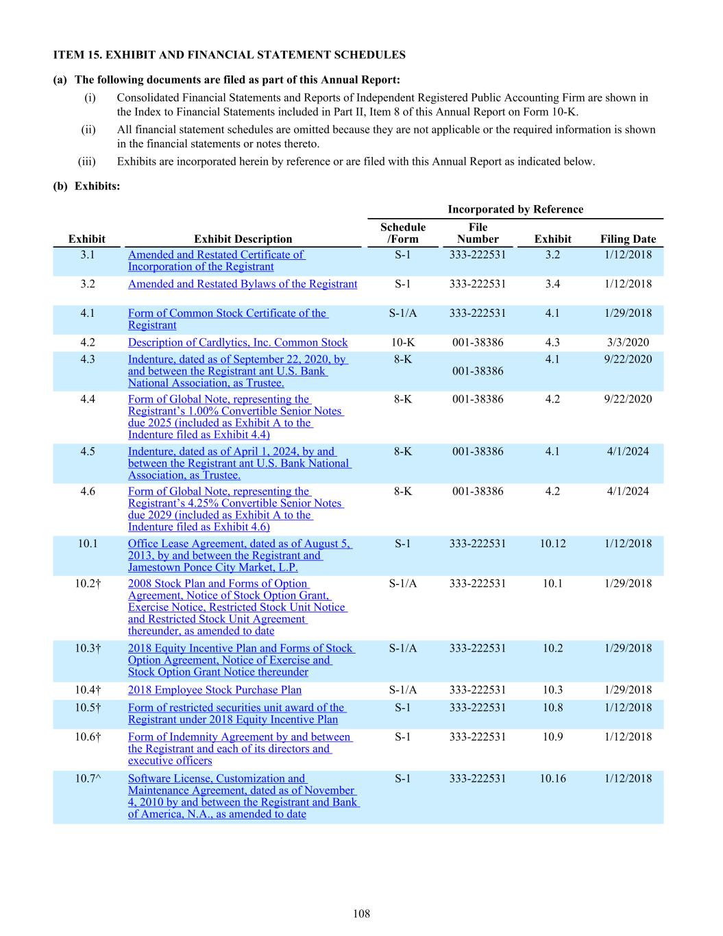 ITEM 15. EXHIBIT AND FINANCIAL STATEMENT SCHEDULES (a) The following documents are filed as part of this Annual Report: (i) Consolidated Financial Statements and Reports of Independent Registered Public Accounting Firm are shown in the Index to Financial Statements included in Part II, Item 8 of this Annual Report on Form 10-K. (ii) All financial statement schedules are omitted because they are not applicable or the required information is shown in the financial statements or notes thereto. (iii) Exhibits are incorporated herein by reference or are filed with this Annual Report as indicated below. (b) Exhibits: Incorporated by Reference Exhibit Exhibit Description Schedule /Form File Number Exhibit Filing Date 3.1 Amended and Restated Certificate of Incorporation of the Registrant S-1 333-222531 3.2 1/12/2018 3.2 Amended and Restated Bylaws of the Registrant S-1 333-222531 3.4 1/12/2018 4.1 Form of Common Stock Certificate of the Registrant S-1/A 333-222531 4.1 1/29/2018 4.2 Description of Cardlytics, Inc. Common Stock 10-K 001-38386 4.3 3/3/2020 4.3 Indenture, dated as of September 22, 2020, by and between the Registrant ant U.S. Bank National Association, as Trustee. 8-K 001-38386 4.1 9/22/2020 4.4 Form of Global Note, representing the Registrant’s 1.00% Convertible Senior Notes due 2025 (included as Exhibit A to the Indenture filed as Exhibit 4.4) 8-K 001-38386 4.2 9/22/2020 4.5 Indenture, dated as of April 1, 2024, by and between the Registrant ant U.S. Bank National Association, as Trustee. 8-K 001-38386 4.1 4/1/2024 4.6 Form of Global Note, representing the Registrant’s 4.25% Convertible Senior Notes due 2029 (included as Exhibit A to the Indenture filed as Exhibit 4.6) 8-K 001-38386 4.2 4/1/2024 10.1 Office Lease Agreement, dated as of August 5, 2013, by and between the Registrant and Jamestown Ponce City Market, L.P. S-1 333-222531 10.12 1/12/2018 10.2† 2008 Stock Plan and Forms of Option Agreement, Notice of Stock Option Grant, Exercise Notice, Restricted Stock Unit Notice and Restricted Stock Unit Agreement thereunder, as amended to date S-1/A 333-222531 10.1 1/29/2018 10.3† 2018 Equity Incentive Plan and Forms of Stock Option Agreement, Notice of Exercise and Stock Option Grant Notice thereunder S-1/A 333-222531 10.2 1/29/2018 10.4† 2018 Employee Stock Purchase Plan S-1/A 333-222531 10.3 1/29/2018 10.5† Form of restricted securities unit award of the Registrant under 2018 Equity Incentive Plan S-1 333-222531 10.8 1/12/2018 10.6† Form of Indemnity Agreement by and between the Registrant and each of its directors and executive officers S-1 333-222531 10.9 1/12/2018 10.7^ Software License, Customization and Maintenance Agreement, dated as of November 4, 2010 by and between the Registrant and Bank of America, N.A., as amended to date S-1 333-222531 10.16 1/12/2018 108