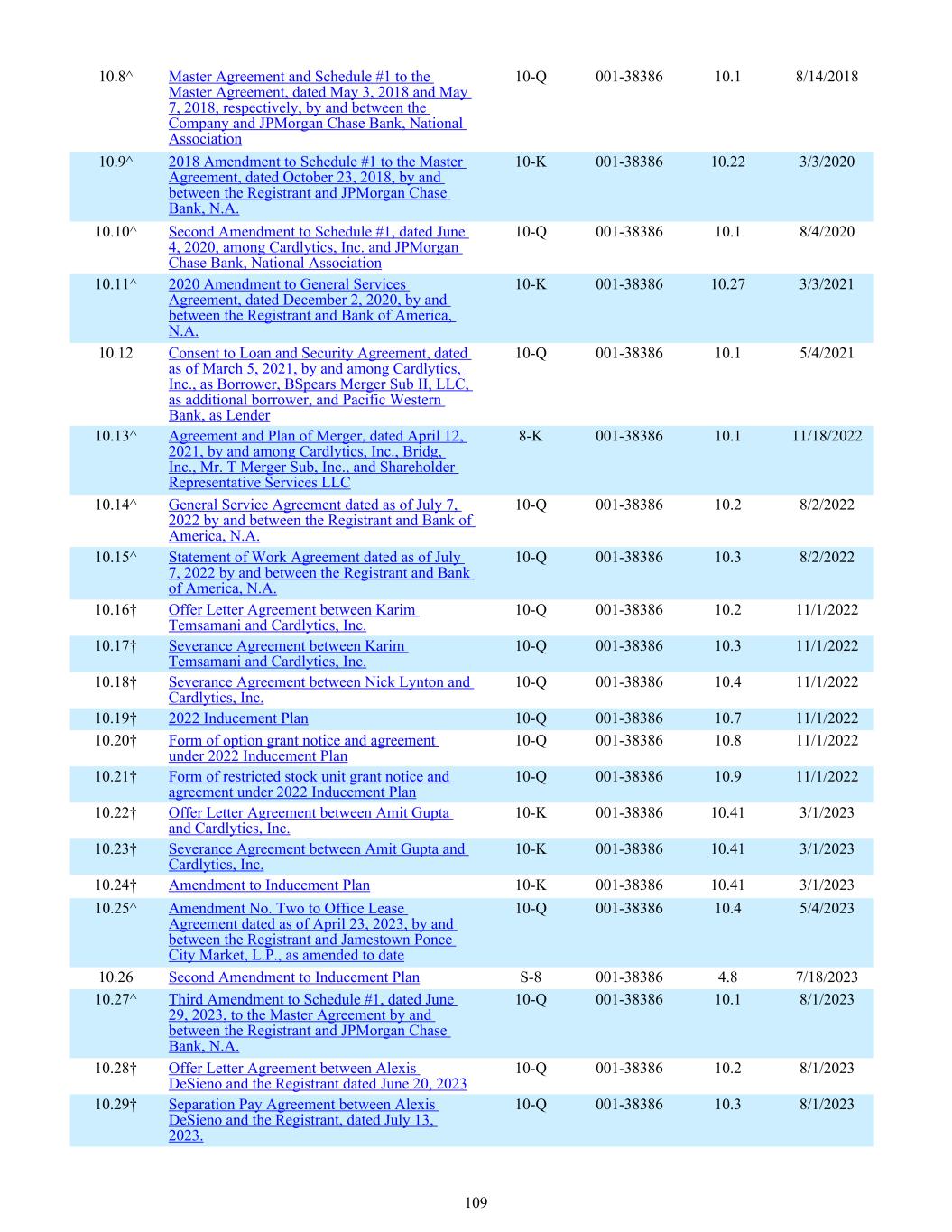 10.8^ Master Agreement and Schedule #1 to the Master Agreement, dated May 3, 2018 and May 7, 2018, respectively, by and between the Company and JPMorgan Chase Bank, National Association 10-Q 001-38386 10.1 8/14/2018 10.9^ 2018 Amendment to Schedule #1 to the Master Agreement, dated October 23, 2018, by and between the Registrant and JPMorgan Chase Bank, N.A. 10-K 001-38386 10.22 3/3/2020 10.10^ Second Amendment to Schedule #1, dated June 4, 2020, among Cardlytics, Inc. and JPMorgan Chase Bank, National Association 10-Q 001-38386 10.1 8/4/2020 10.11^ 2020 Amendment to General Services Agreement, dated December 2, 2020, by and between the Registrant and Bank of America, N.A. 10-K 001-38386 10.27 3/3/2021 10.12 Consent to Loan and Security Agreement, dated as of March 5, 2021, by and among Cardlytics, Inc., as Borrower, BSpears Merger Sub II, LLC, as additional borrower, and Pacific Western Bank, as Lender 10-Q 001-38386 10.1 5/4/2021 10.13^ Agreement and Plan of Merger, dated April 12, 2021, by and among Cardlytics, Inc., Bridg, Inc., Mr. T Merger Sub, Inc., and Shareholder Representative Services LLC 8-K 001-38386 10.1 11/18/2022 10.14^ General Service Agreement dated as of July 7, 2022 by and between the Registrant and Bank of America, N.A. 10-Q 001-38386 10.2 8/2/2022 10.15^ Statement of Work Agreement dated as of July 7, 2022 by and between the Registrant and Bank of America, N.A. 10-Q 001-38386 10.3 8/2/2022 10.16† Offer Letter Agreement between Karim Temsamani and Cardlytics, Inc. 10-Q 001-38386 10.2 11/1/2022 10.17† Severance Agreement between Karim Temsamani and Cardlytics, Inc. 10-Q 001-38386 10.3 11/1/2022 10.18† Severance Agreement between Nick Lynton and Cardlytics, Inc. 10-Q 001-38386 10.4 11/1/2022 10.19† 2022 Inducement Plan 10-Q 001-38386 10.7 11/1/2022 10.20† Form of option grant notice and agreement under 2022 Inducement Plan 10-Q 001-38386 10.8 11/1/2022 10.21† Form of restricted stock unit grant notice and agreement under 2022 Inducement Plan 10-Q 001-38386 10.9 11/1/2022 10.22† Offer Letter Agreement between Amit Gupta and Cardlytics, Inc. 10-K 001-38386 10.41 3/1/2023 10.23† Severance Agreement between Amit Gupta and Cardlytics, Inc. 10-K 001-38386 10.41 3/1/2023 10.24† Amendment to Inducement Plan 10-K 001-38386 10.41 3/1/2023 10.25^ Amendment No. Two to Office Lease Agreement dated as of April 23, 2023, by and between the Registrant and Jamestown Ponce City Market, L.P., as amended to date 10-Q 001-38386 10.4 5/4/2023 10.26 Second Amendment to Inducement Plan S-8 001-38386 4.8 7/18/2023 10.27^ Third Amendment to Schedule #1, dated June 29, 2023, to the Master Agreement by and between the Registrant and JPMorgan Chase Bank, N.A. 10-Q 001-38386 10.1 8/1/2023 10.28† Offer Letter Agreement between Alexis DeSieno and the Registrant dated June 20, 2023 10-Q 001-38386 10.2 8/1/2023 10.29† Separation Pay Agreement between Alexis DeSieno and the Registrant, dated July 13, 2023. 10-Q 001-38386 10.3 8/1/2023 109