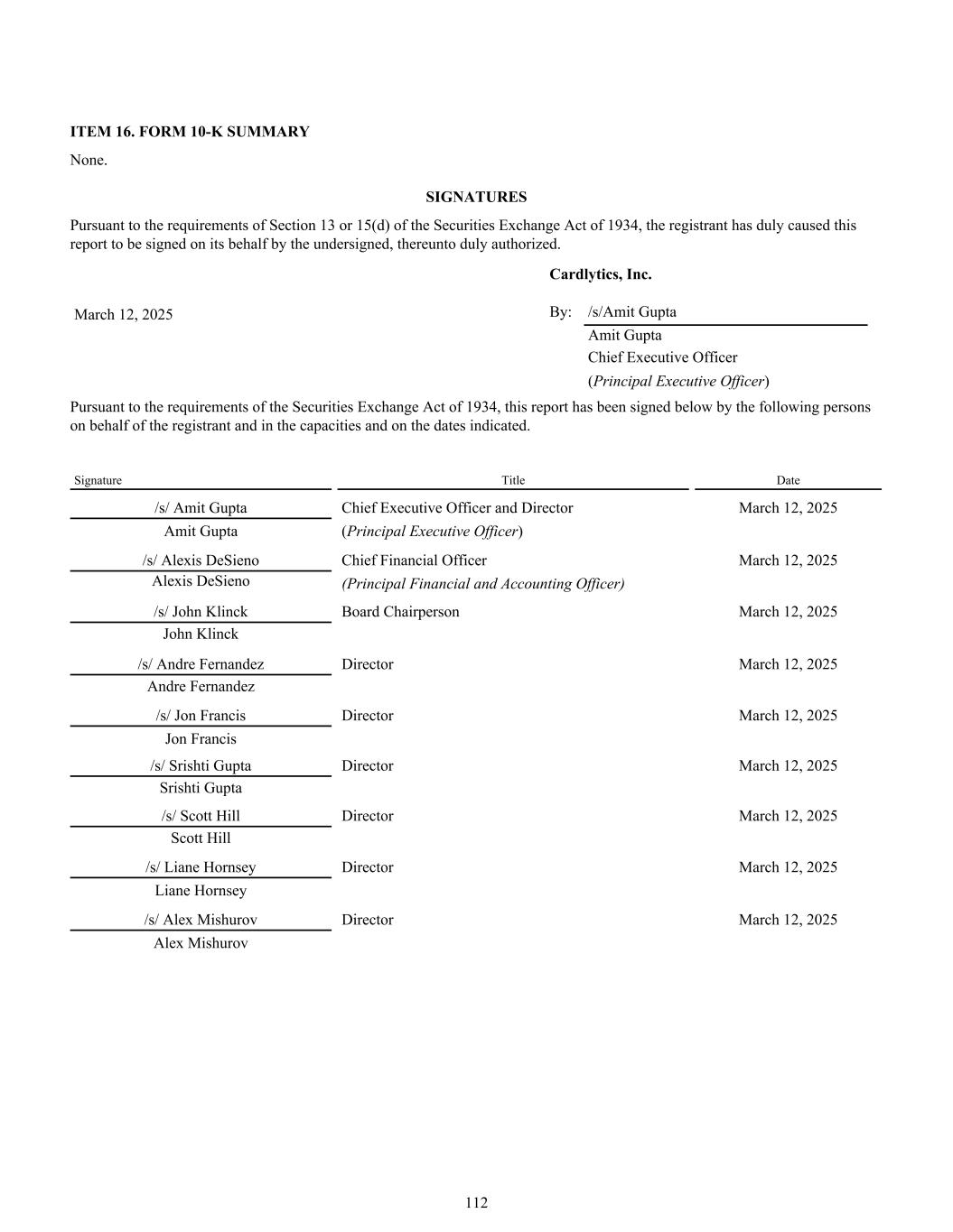 ITEM 16. FORM 10-K SUMMARY None. SIGNATURES Pursuant to the requirements of Section 13 or 15(d) of the Securities Exchange Act of 1934, the registrant has duly caused this report to be signed on its behalf by the undersigned, thereunto duly authorized. Cardlytics, Inc. March 12, 2025 By: /s/Amit Gupta Amit Gupta Chief Executive Officer (Principal Executive Officer) Pursuant to the requirements of the Securities Exchange Act of 1934, this report has been signed below by the following persons on behalf of the registrant and in the capacities and on the dates indicated. Signature Title Date /s/ Amit Gupta Chief Executive Officer and Director March 12, 2025 Amit Gupta (Principal Executive Officer) /s/ Alexis DeSieno Chief Financial Officer March 12, 2025 Alexis DeSieno (Principal Financial and Accounting Officer) /s/ John Klinck Board Chairperson March 12, 2025 John Klinck /s/ Andre Fernandez Director March 12, 2025 Andre Fernandez /s/ Jon Francis Director March 12, 2025 Jon Francis /s/ Srishti Gupta Director March 12, 2025 Srishti Gupta /s/ Scott Hill Director March 12, 2025 Scott Hill /s/ Liane Hornsey Director March 12, 2025 Liane Hornsey /s/ Alex Mishurov Director March 12, 2025 Alex Mishurov 112