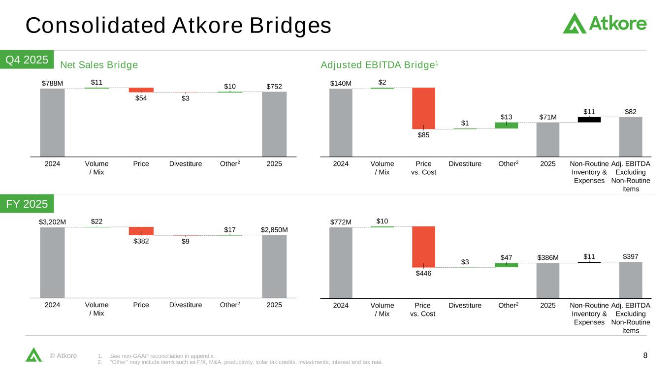 7© Atkore Q4 and Full Year 2025 1. See non-GAAP reconciliation in appendix. 788 752 Q4 2024 Q4 2025 -5% 73 -54 Q4 2024 Q4 2025 -174% 140 71 Q4 2024 Q4 2025 -49% 2.43 0.69 Q4 2024 Q4 2025 -72% Net Sales $M Net Income/(Loss) $M Adjusted EBITDA1 $M Adjusted Diluted EPS1 $/share 3,202 2,850 FY 2024 FY 2025 -11% 473 -15 FY 2024 FY 2025 -103% 772 386 FY 2024 FY 2025 -50% 14.48 6.05 FY 2024 FY 2025 -58% 2.02 -1.62 Q4 2024 Q4 2025 -180% Diluted EPS/(Loss) Per Share $/share 12.69 -0.45 FY 2024 FY 2025 -104% Q4 2023Q4 2025 FY 2025 Includes impairment impact Includes impairment impact Includes impairment impact Includes impairment impact