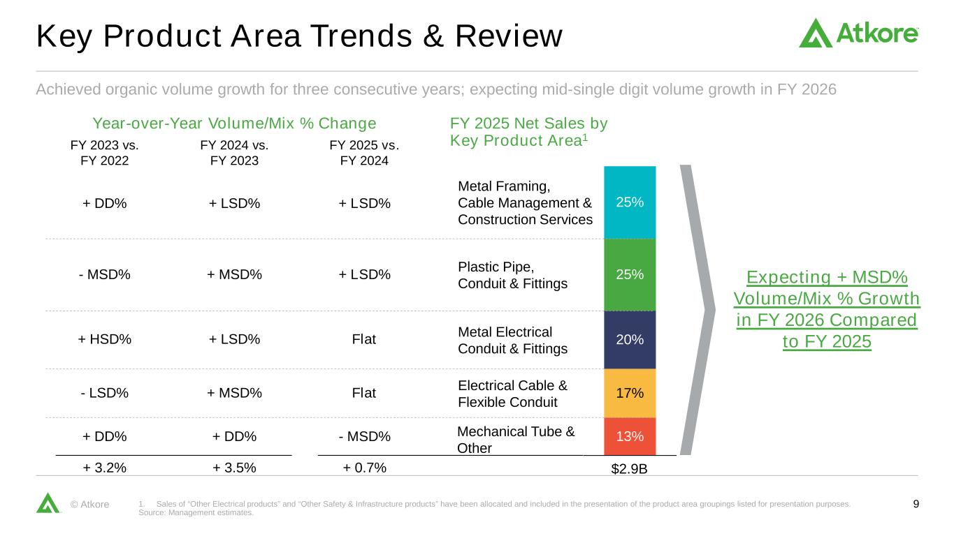 8© Atkore Consolidated Atkore Bridges 1. See non-GAAP reconciliation in appendix. 2. “Other” may include items such as F/X, M&A, productivity, solar tax credits, investments, interest and tax rate. Adjusted EBITDA Bridge1Net Sales Bridge $752$11 $54 $3 $10 2024 Volume / Mix Price Divestiture Other2 2025 $788M $82 $2 $85 $1 $13 $11 2024 Volume / Mix Price vs. Cost Divestiture Other2 2025 Non-Routine Inventory & Expenses Adj. EBITDA Excluding Non-Routine Items $140M $71M $22 $382 $9 $17 2024 Volume / Mix Price Divestiture Other2 2025 $3,202M $2,850M $397 $10 $446 $3 $47 $11 2024 Volume / Mix Price vs. Cost Divestiture Other2 2025 Non-Routine Inventory & Expenses Adj. EBITDA Excluding Non-Routine Items $772M $386M Q4 2025 FY 2025