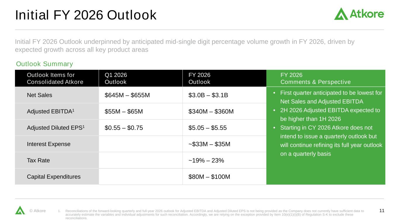 11© Atkore Initial FY 2026 Outlook Outlook Summary 1. Reconciliations of the forward-looking quarterly and full-year 2026 outlook for Adjusted EBITDA and Adjusted Diluted EPS is not being provided as the Company does not currently have sufficient data to accurately estimate the variables and individual adjustments for such reconciliation. Accordingly, we are relying on the exception provided by Item 10(e)(1)(i)(B) of Regulation S-K to exclude these reconciliations. Outlook Items for Consolidated Atkore Q1 2026 Outlook FY 2026 Outlook FY 2026 Comments & Perspective Net Sales $645M – $655M $3.0B – $3.1B • First quarter anticipated to be lowest for Net Sales and Adjusted EBITDA • 2H 2026 Adjusted EBITDA expected to be higher than 1H 2026 • Starting in CY 2026 Atkore does not intend to issue a quarterly outlook but will continue refining its full year outlook on a quarterly basis Adjusted EBITDA1 $55M – $65M $340M – $360M Adjusted Diluted EPS1 $0.55 – $0.75 $5.05 – $5.55 Interest Expense ~$33M – $35M Tax Rate ~19% – 23% Capital Expenditures $80M – $100M Initial FY 2026 Outlook underpinned by anticipated mid-single digit percentage volume growth in FY 2026, driven by expected growth across all key product areas