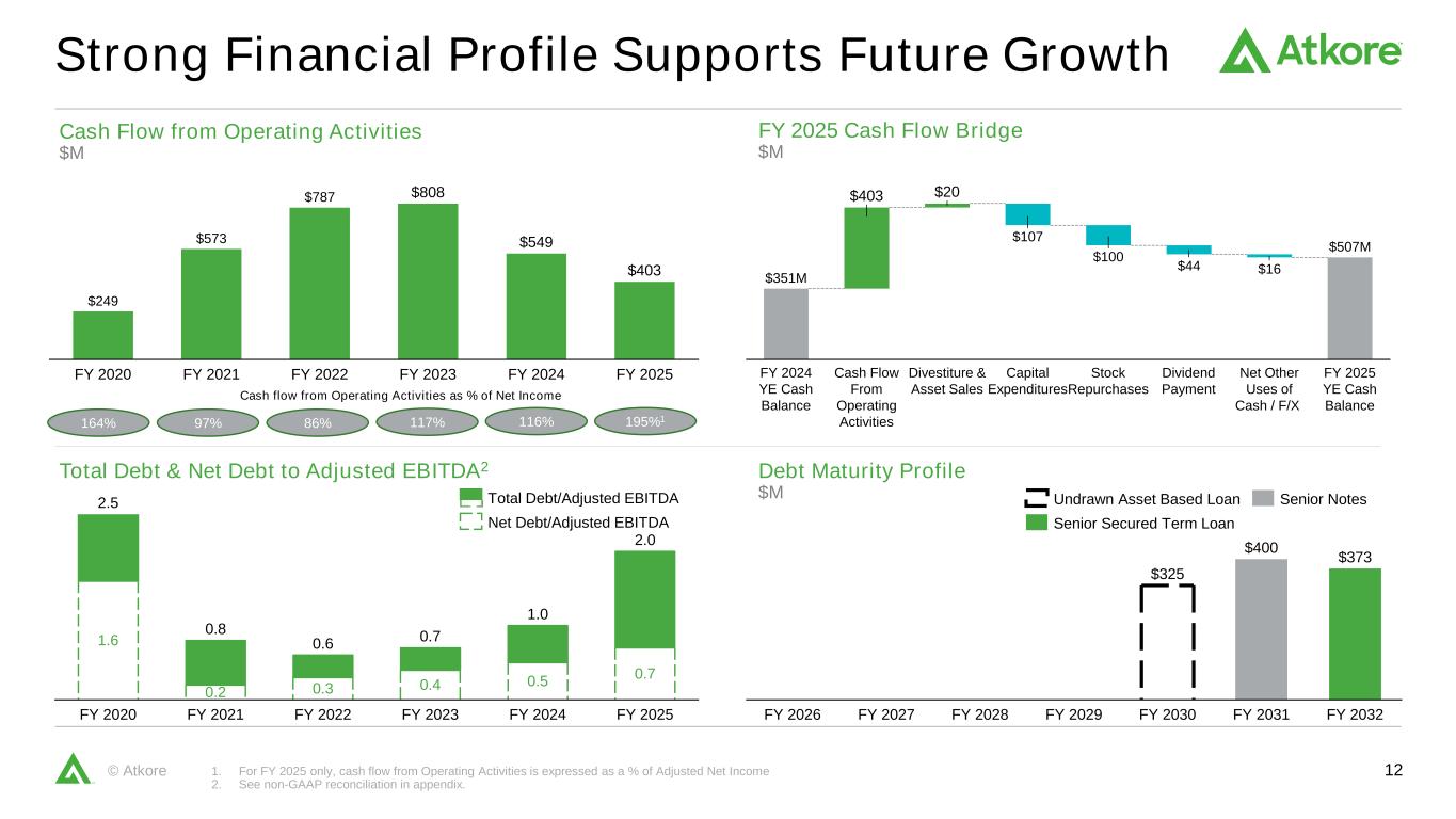 24© Atkore Total Debt to Net Debt and Leverage Ratio Consolidated Atkore Inc. ($ in thousands) September 30, 2025 September 30, 2024 September 30, 2023 September 30, 2022 September 30, 2021 September 30, 2020 Short-term debt and current maturities of long-term debt $ 3,730 $ — $ — $ — $ — $ — Long-term debt 756,802 764,838 762,687 760,537 758,386 803,736 Total debt 760,532 764,838 762,687 760,537 758,386 803,736 Less cash and cash equivalents 506,699 351,385 388,114 388,751 576,289 $ 284,471 Net debt $ 253,833 $ 413,453 $ 374,573 $ 371,786 $ 182,097 $ 519,265 TTM Adjusted EBITDA (a) $ 386,394 $ 771,713 $ 1,042,127 $ 1,341,790 $ 897,547 $ 326,635 Total debt/TTM Adjusted EBITDA 2.0 x 1.0 x 0.7 x 0.6 x 0.8 x 2.5 x Net debt/TTM Adjusted EBITDA 0.7 x 0.5 x 0.4 x 0.3 x 0.2 x 1.6 x (a) Leverage ratio and TTM Adjusted EBITDA reconciliations for all periods above can be found either in the appendix, or in to Form 8-K filed on November 17, 2023, November 18, 2022, November 18, 2021, November 19, 2020, November 22, 2019.