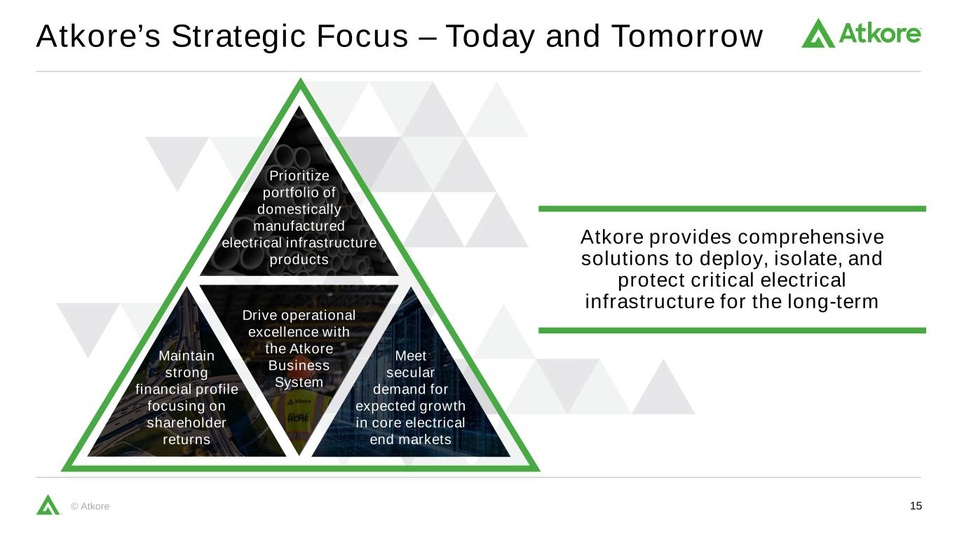 14© Atkore Expansive End Market Use Supports Resilience En d M ar ke ts b y Es t. Si ze 1 $0B - $50B $50B – $100B $100B + Es t. FY 2 02 6 G ro w th H ig h U se D en si ty P ro du ct s • HDPE Conduit • Cable Tray • PVC Water • HDPE Pressure Piping • Steel Conduit • Metal Framing • Wire Basket & Cable Tray • PVC Conduit • Fiberglass Conduit • PVC Conduit • Steel Conduit • Armored Cable • Metal Framing • Cable Management • PVC Conduit • Steel Conduit • Armored Cable • Metal Framing • Cable Management • Armored Cable • Steel Conduit • Metal Framing • PVC Conduit • Steel Conduit • Fiberglass Conduit • Metal Framing • PVC Conduit • Steel Conduit • Armored Cable • Metal Framing • Cable Management • PVC Conduit • Steel Conduit • Armored Cable • Metal Framing • Cable Management Multi-Family: • PVC Conduit • Steel Conduit • Armored Cable • Metal Framing • Cable Management Single Family: • PVC Conduit 1. Put in place construction spending as reported by the U.S. Census Bureau as of July 2025 Source: US Department of Commerce; Dodge Construction Network; Baird and tED Magazine; Company analysis and estimates Atkore’s broad portfolio complimented by superior service and a national distribution network supports growth across diverse construction end markets; the diversity of end-market use enables resilience in fluctuating market conditions Data CenterMunicipal Water Office EducationHealthcare ManufacturingWarehouse ResidentialTelecom Power Utilities