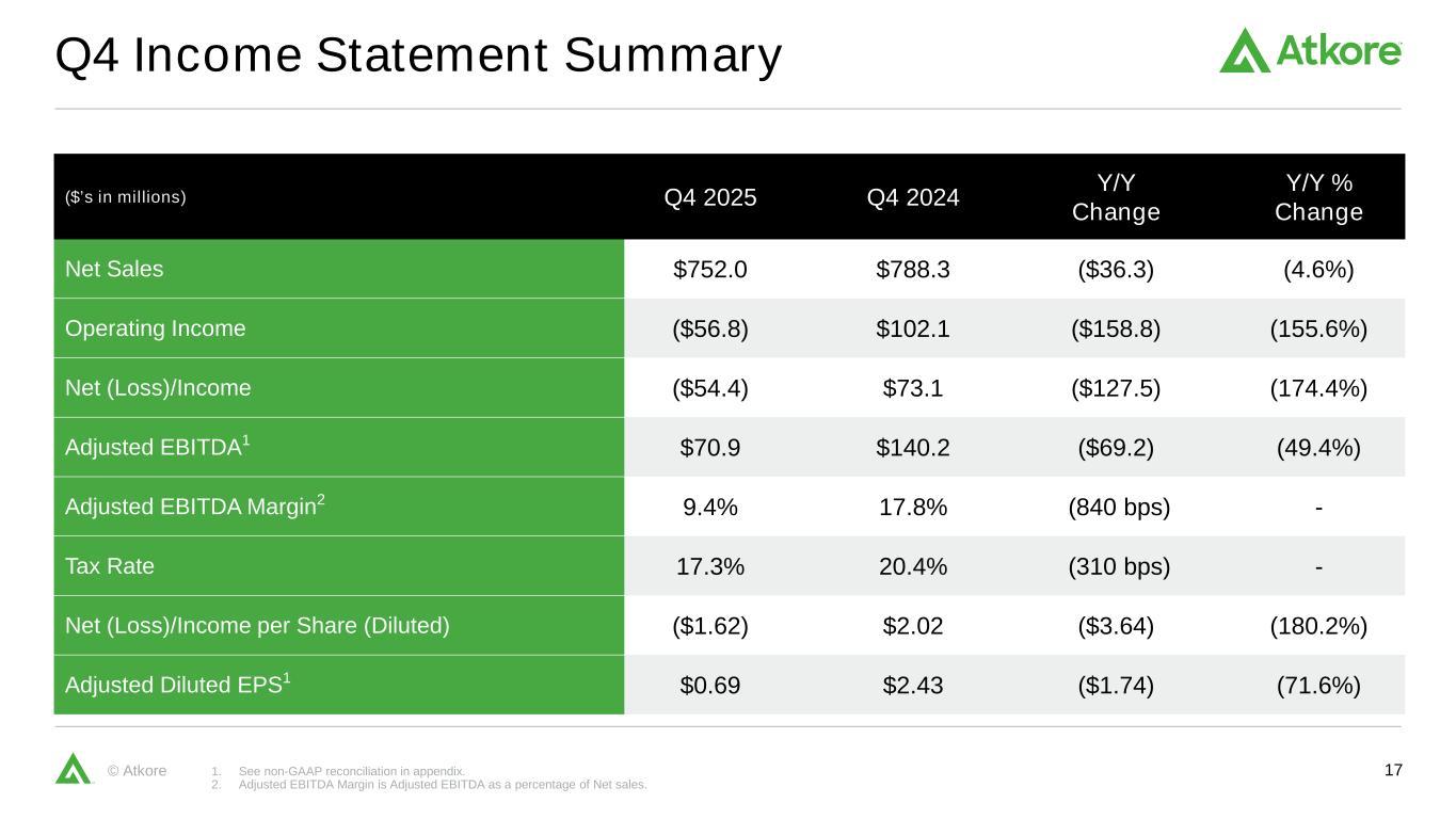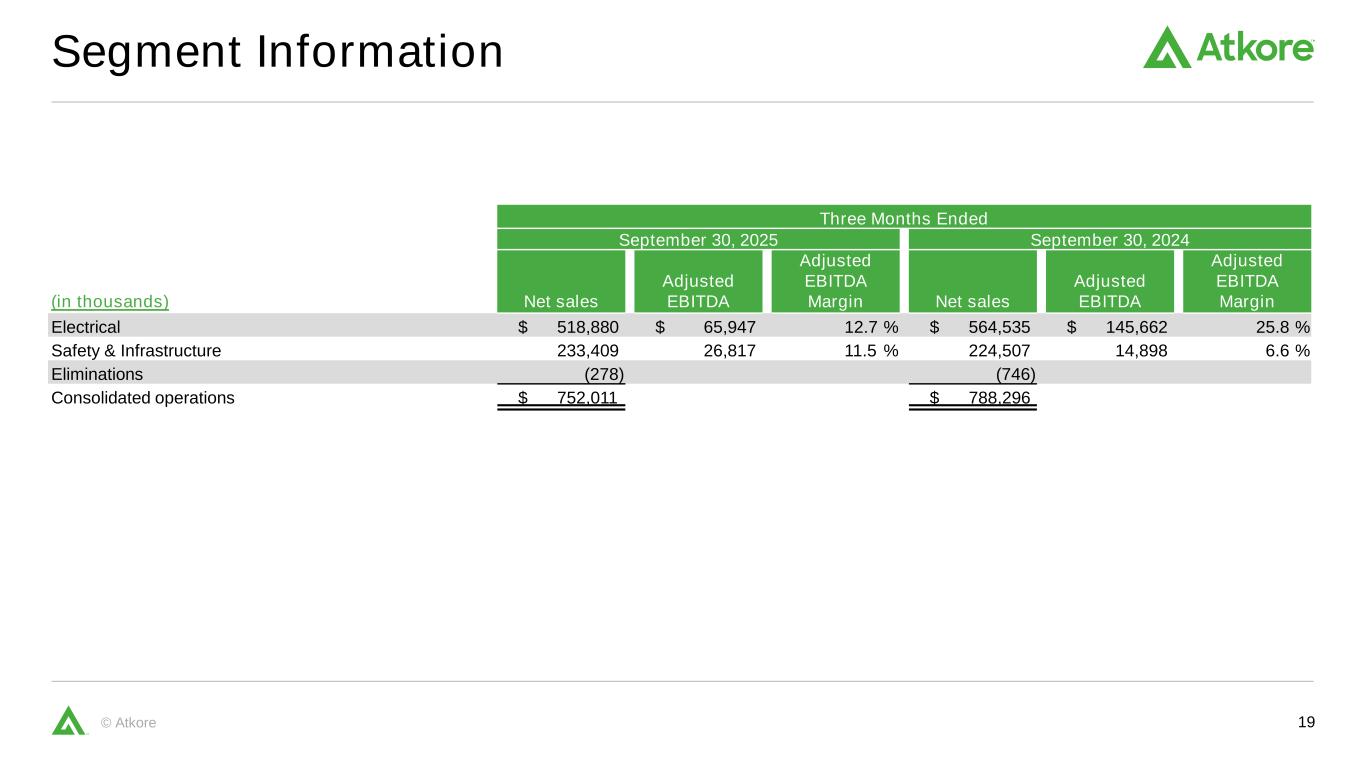 19© Atkore Segment Information Three Months Ended September 30, 2025 September 30, 2024 (in thousands) Net sales Adjusted EBITDA Adjusted EBITDA Margin Net sales Adjusted EBITDA Adjusted EBITDA Margin Electrical $ 518,880 $ 65,947 12.7 % $ 564,535 $ 145,662 25.8 % Safety & Infrastructure 233,409 26,817 11.5 % 224,507 14,898 6.6 % Eliminations (278) (746) Consolidated operations $ 752,011 $ 788,296