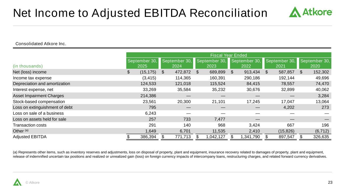 22© Atkore tkore Net Income to Adjusted EBITDA Reconciliation Consolidated Atkore Inc. Three Months Ended Fiscal Year Ended (in thousands) September 30, 2025 September 30, 2024 September 30, 2025 September 30, 2024 Net (loss) income $ (54,420) $ 73,119 $ (15,175) $ 472,872 Income tax expense (11,350) 18,759 (3,415) 114,365 Depreciation and amortization 36,929 32,611 124,533 121,018 Interest expense, net 7,926 9,526 33,269 35,584 Stock-based compensation 2,505 6,027 23,561 20,300 Loss on extinguishment of debt 795 — 795 — Loss on sale of a business 142 — 6,243 — Asset Impairment Charges 86,654 — 214,386 — Other (a) 1,734 108 2,197 7,574 Adjusted EBITDA $ 70,915 $ 140,150 $ 386,394 $ 771,713 Other Non-Routine Items Burdened in EBITDA Items related to Advisory & Legal Services 5,442 5,442 Items related to Inventory Adjustments at Phoenix manufacturing site 5,821 5,821 Adjusted EBITDA Excluding Non-Routine Items $ 82,178 $ 397,657 (a) Represents other items, such as inventory reserves and adjustments, loss on disposal of property, plant and equipment, insurance recovery related to damages of property, plant and equipment, release of indemnified uncertain tax positions and realized or unrealized gain (loss) on foreign currency impacts of intercompany loans, losses on assets held for sale, transaction costs, certain legal matters, restructuring charges, and related forward currency derivatives.