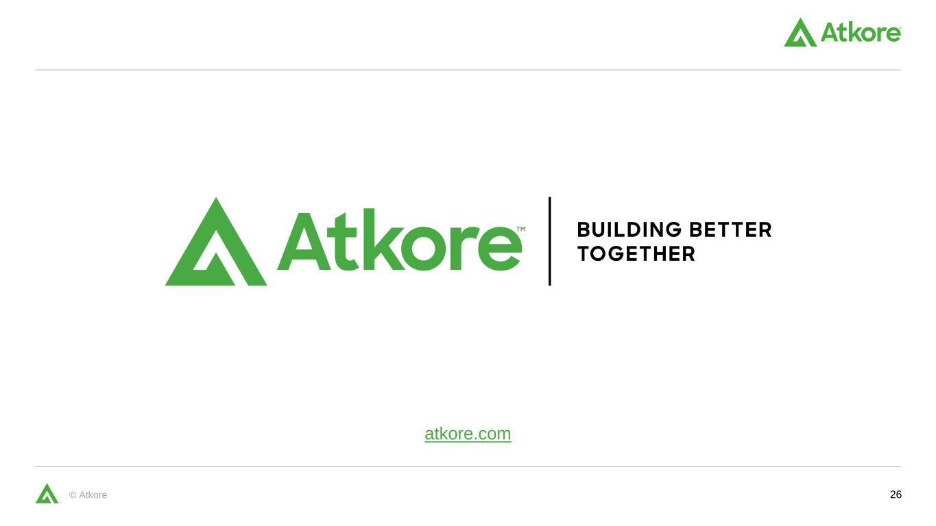 25© Atkore Abbreviations listed in alphanumeric order Glossary of Terms Abbreviation Description 1H First Half 2H Second Half ABS Atkore Business System Adj. Adjusted AI Artificial Intelligence B Billion Capex Capital Expenditures CY Calendar Year DD% Double Digit Percentage EBITDA Earnings Before Interest, Taxes, Depreciation, & Amortization EPD Environmental Product Declaration EPS Earnings Per Share ESG Environmental, Social, and Governance Est. Estimated Excl. Excluding FX or F/X Foreign Exchange FY Fiscal Year HDPE High Density Polyethylene HSD% High Single Digit Percentage IPO Initial Public Offering Abbreviation Description IRA Inflation Reduction Act LDD% Low Double Digit Percentage LSD% Low Single Digit Percentage M Million M&A Mergers & Acquisitions MSD% Mid Single Digit Percentage PVC Polyvinyl Chloride Q1 First Fiscal Quarter Q2 Second Fiscal Quarter Q3 Third Fiscal Quarter Q4 Fourth Fiscal Quarter RSC Regional Service Center S&I Safety & Infrastructure TTM Trailing Twelve Months U.S. United States of America USD United States Dollar #X Number of Times YE Year End YTD Year to Date