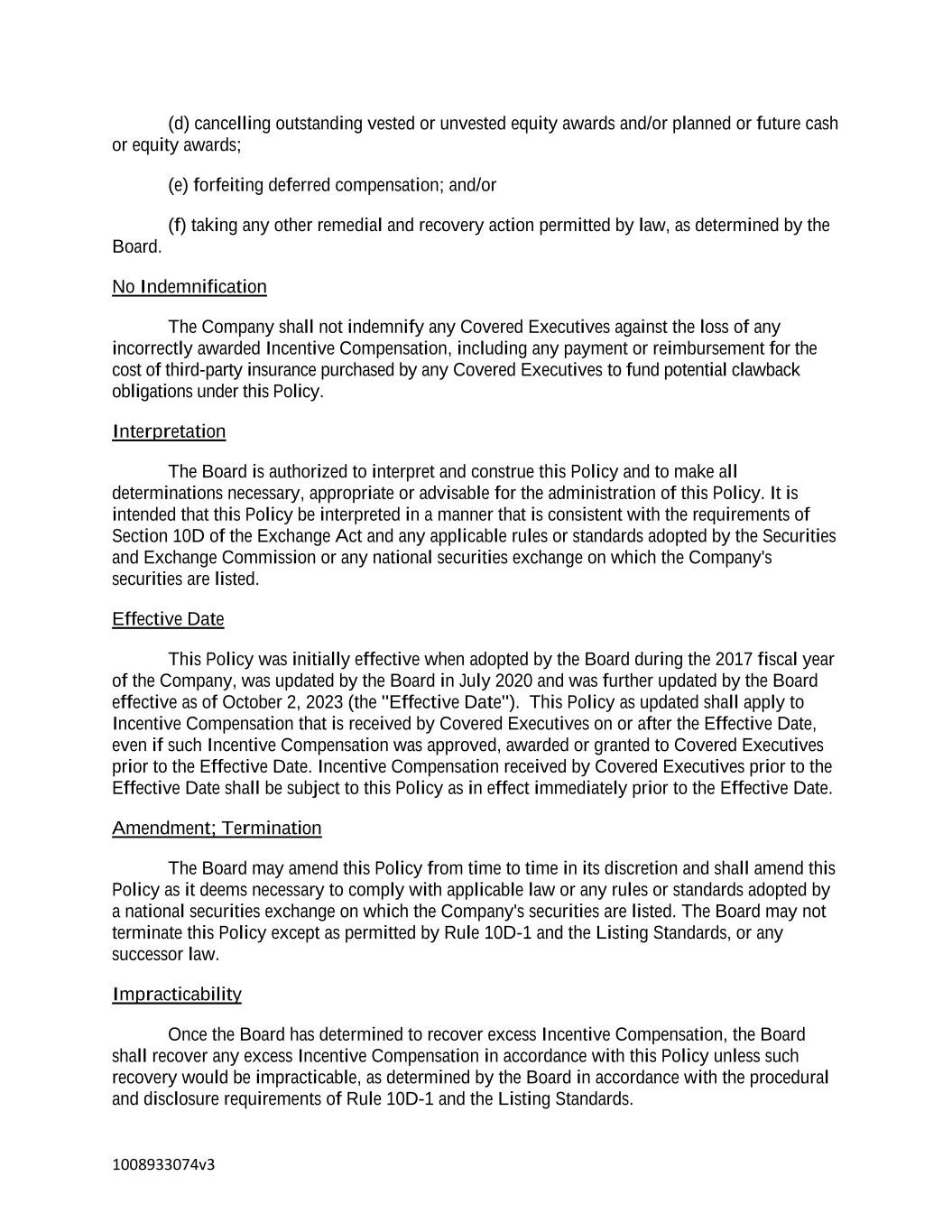 1008933074v3 (d) cancelling outstanding vested or unvested equity awards and/or planned or future cash or equity awards; (e) forfeiting deferred compensation; and/or (f) taking any other remedial and recovery action permitted by law, as determined by the Board. No Indemnification The Company shall not indemnify any Covered Executives against the loss of any incorrectly awarded Incentive Compensation, including any payment or reimbursement for the cost of third-party insurance purchased by any Covered Executives to fund potential clawback obligations under this Policy. Interpretation The Board is authorized to interpret and construe this Policy and to make all determinations necessary, appropriate or advisable for the administration of this Policy. It is intended that this Policy be interpreted in a manner that is consistent with the requirements of Section 10D of the Exchange Act and any applicable rules or standards adopted by the Securities and Exchange Commission or any national securities exchange on which the Company's securities are listed. Effective Date This Policy was initially effective when adopted by the Board during the 2017 fiscal year of the Company, was updated by the Board in July 2020 and was further updated by the Board effective as of October 2, 2023 (the "Effective Date"). This Policy as updated shall apply to Incentive Compensation that is received by Covered Executives on or after the Effective Date, even if such Incentive Compensation was approved, awarded or granted to Covered Executives prior to the Effective Date. Incentive Compensation received by Covered Executives prior to the Effective Date shall be subject to this Policy as in effect immediately prior to the Effective Date. Amendment; Termination The Board may amend this Policy from time to time in its discretion and shall amend this Policy as it deems necessary to comply with applicable law or any rules or standards adopted by a national securities exchange on which the Company's securities are listed. The Board may not terminate this Policy except as permitted by Rule 10D-1 and the Listing Standards, or any successor law. Impracticability Once the Board has determined to recover excess Incentive Compensation, the Board shall recover any excess Incentive Compensation in accordance with this Policy unless such recovery would be impracticable, as determined by the Board in accordance with the procedural and disclosure requirements of Rule 10D-1 and the Listing Standards.