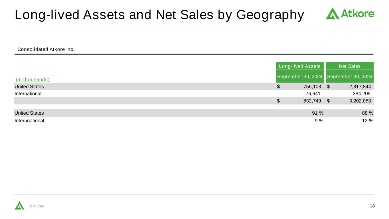 18© Atkore Long-lived Assets and Net Sales by Geography Consolidated Atkore Inc. Long-lived Assets Net Sales (in thousands) September 30, 2024 September 30, 2024 United States $ 756,108 $ 2,817,844 International 76,641 384,209 $ 832,749 $ 3,202,053 United States 91 % 88 % Internnational 9 % 12 %