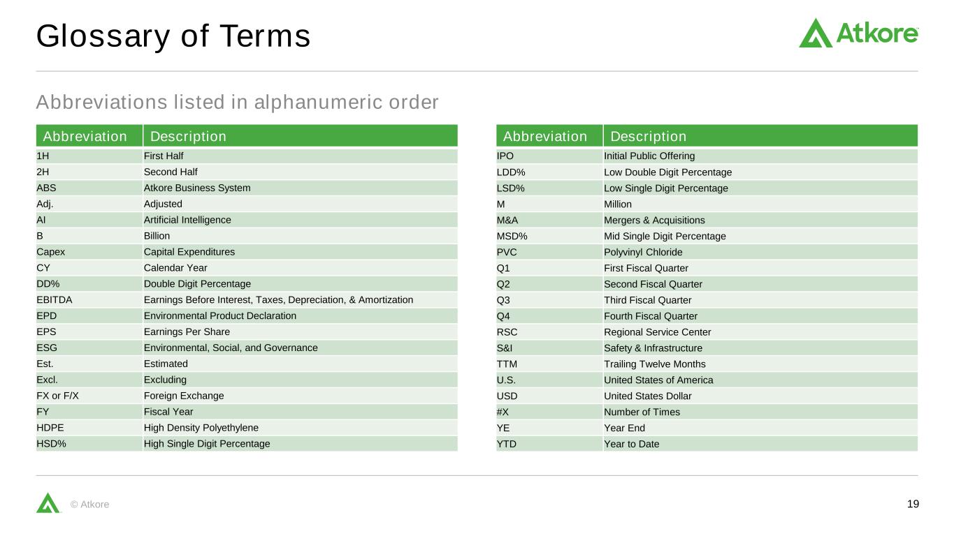19© Atkore Abbreviations listed in alphanumeric order Glossary of Terms Abbreviation Description 1H First Half 2H Second Half ABS Atkore Business System Adj. Adjusted AI Artificial Intelligence B Billion Capex Capital Expenditures CY Calendar Year DD% Double Digit Percentage EBITDA Earnings Before Interest, Taxes, Depreciation, & Amortization EPD Environmental Product Declaration EPS Earnings Per Share ESG Environmental, Social, and Governance Est. Estimated Excl. Excluding FX or F/X Foreign Exchange FY Fiscal Year HDPE High Density Polyethylene HSD% High Single Digit Percentage Abbreviation Description IPO Initial Public Offering LDD% Low Double Digit Percentage LSD% Low Single Digit Percentage M Million M&A Mergers & Acquisitions MSD% Mid Single Digit Percentage PVC Polyvinyl Chloride Q1 First Fiscal Quarter Q2 Second Fiscal Quarter Q3 Third Fiscal Quarter Q4 Fourth Fiscal Quarter RSC Regional Service Center S&I Safety & Infrastructure TTM Trailing Twelve Months U.S. United States of America USD United States Dollar #X Number of Times YE Year End YTD Year to Date