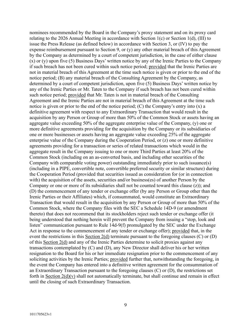 9 1011705623v1 nominees recommended by the Board in the Company’s proxy statement and on its proxy card relating to the 2026 Annual Meeting in accordance with Section 1(c) or Section 1(d), (III) to issue the Press Release (as defined below) in accordance with Section 3, or (IV) to pay the expense reimbursement pursuant to Section 9, or (y) any other material breach of this Agreement by the Company as determined by a court of competent jurisdiction, in the case of either clause (x) or (y) upon five (5) Business Days’ written notice by any of the Irenic Parties to the Company if such breach has not been cured within such notice period; provided that the Irenic Parties are not in material breach of this Agreement at the time such notice is given or prior to the end of the notice period; (B) any material breach of the Consulting Agreement by the Company, as determined by a court of competent jurisdiction, upon five (5) Business Days’ written notice by any of the Irenic Parties or Mr. Taten to the Company if such breach has not been cured within such notice period; provided that Mr. Taten is not in material breach of the Consulting Agreement and the Irenic Parties are not in material breach of this Agreement at the time such notice is given or prior to the end of the notice period; (C) the Company’s entry into (x) a definitive agreement with respect to any Extraordinary Transaction that would result in the acquisition by any Person or Group of more than 50% of the Common Stock or assets having an aggregate value exceeding 50% of the aggregate enterprise value of the Company, (y) one or more definitive agreements providing for the acquisition by the Company or its subsidiaries of one or more businesses or assets having an aggregate value exceeding 25% of the aggregate enterprise value of the Company during the Cooperation Period, or (z) one or more definitive agreements providing for a transaction or series of related transactions which would in the aggregate result in the Company issuing to one or more Third Parties at least 20% of the Common Stock (including on an as-converted basis, and including other securities of the Company with comparable voting power) outstanding immediately prior to such issuance(s) (including in a PIPE, convertible note, convertible preferred security or similar structure) during the Cooperation Period (provided that securities issued as consideration for (or in connection with) the acquisition of the assets, securities and/or business(es) of another Person by the Company or one or more of its subsidiaries shall not be counted toward this clause (z)); and (D) the commencement of any tender or exchange offer (by any Person or Group other than the Irenic Parties or their Affiliates) which, if consummated, would constitute an Extraordinary Transaction that would result in the acquisition by any Person or Group of more than 50% of the Common Stock, where the Company files with the SEC a Schedule 14D-9 (or amendment thereto) that does not recommend that its stockholders reject such tender or exchange offer (it being understood that nothing herein will prevent the Company from issuing a “stop, look and listen” communication pursuant to Rule 14d-9(f) promulgated by the SEC under the Exchange Act in response to the commencement of any tender or exchange offer); provided that, in the event the restrictions in this Section 2(d) terminate pursuant to the foregoing clauses (C) or (D) of this Section 2(d) and any of the Irenic Parties determine to solicit proxies against any transactions contemplated by (C) and (D), any New Director shall deliver his or her written resignation to the Board for his or her immediate resignation prior to the commencement of any soliciting activities by the Irenic Parties; provided further that, notwithstanding the foregoing, in the event the Company has entered into a definitive written agreement for the consummation of an Extraordinary Transaction pursuant to the foregoing clauses (C) or (D), the restrictions set forth in Section 2(d)(v) shall not automatically terminate, but shall continue and remain in effect until the closing of such Extraordinary Transaction.