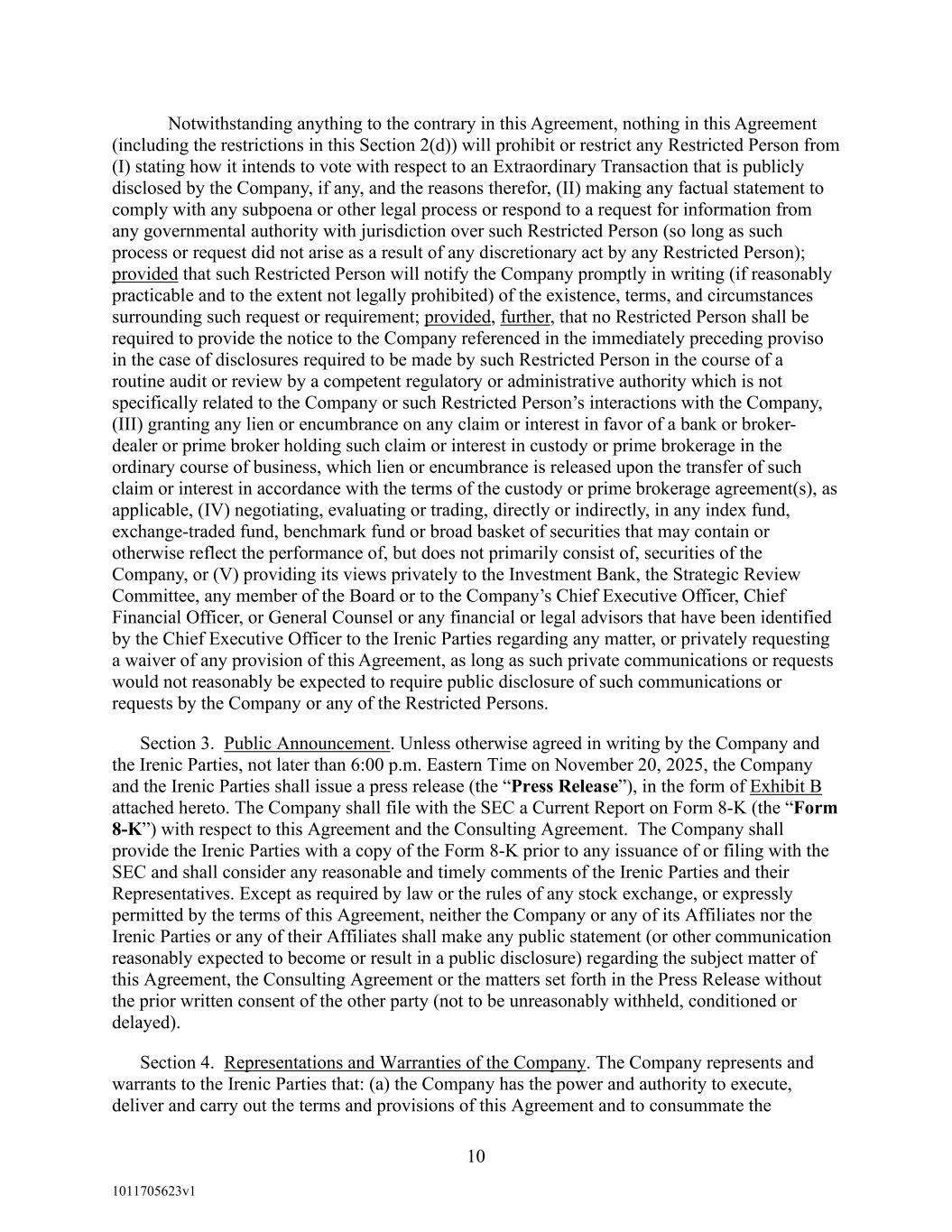 10 1011705623v1 Notwithstanding anything to the contrary in this Agreement, nothing in this Agreement (including the restrictions in this Section 2(d)) will prohibit or restrict any Restricted Person from (I) stating how it intends to vote with respect to an Extraordinary Transaction that is publicly disclosed by the Company, if any, and the reasons therefor, (II) making any factual statement to comply with any subpoena or other legal process or respond to a request for information from any governmental authority with jurisdiction over such Restricted Person (so long as such process or request did not arise as a result of any discretionary act by any Restricted Person); provided that such Restricted Person will notify the Company promptly in writing (if reasonably practicable and to the extent not legally prohibited) of the existence, terms, and circumstances surrounding such request or requirement; provided, further, that no Restricted Person shall be required to provide the notice to the Company referenced in the immediately preceding proviso in the case of disclosures required to be made by such Restricted Person in the course of a routine audit or review by a competent regulatory or administrative authority which is not specifically related to the Company or such Restricted Person’s interactions with the Company, (III) granting any lien or encumbrance on any claim or interest in favor of a bank or broker- dealer or prime broker holding such claim or interest in custody or prime brokerage in the ordinary course of business, which lien or encumbrance is released upon the transfer of such claim or interest in accordance with the terms of the custody or prime brokerage agreement(s), as applicable, (IV) negotiating, evaluating or trading, directly or indirectly, in any index fund, exchange-traded fund, benchmark fund or broad basket of securities that may contain or otherwise reflect the performance of, but does not primarily consist of, securities of the Company, or (V) providing its views privately to the Investment Bank, the Strategic Review Committee, any member of the Board or to the Company’s Chief Executive Officer, Chief Financial Officer, or General Counsel or any financial or legal advisors that have been identified by the Chief Executive Officer to the Irenic Parties regarding any matter, or privately requesting a waiver of any provision of this Agreement, as long as such private communications or requests would not reasonably be expected to require public disclosure of such communications or requests by the Company or any of the Restricted Persons. Section 3. Public Announcement. Unless otherwise agreed in writing by the Company and the Irenic Parties, not later than 6:00 p.m. Eastern Time on November 20, 2025, the Company and the Irenic Parties shall issue a press release (the “Press Release”), in the form of Exhibit B attached hereto. The Company shall file with the SEC a Current Report on Form 8-K (the “Form 8-K”) with respect to this Agreement and the Consulting Agreement. The Company shall provide the Irenic Parties with a copy of the Form 8-K prior to any issuance of or filing with the SEC and shall consider any reasonable and timely comments of the Irenic Parties and their Representatives. Except as required by law or the rules of any stock exchange, or expressly permitted by the terms of this Agreement, neither the Company or any of its Affiliates nor the Irenic Parties or any of their Affiliates shall make any public statement (or other communication reasonably expected to become or result in a public disclosure) regarding the subject matter of this Agreement, the Consulting Agreement or the matters set forth in the Press Release without the prior written consent of the other party (not to be unreasonably withheld, conditioned or delayed). Section 4. Representations and Warranties of the Company. The Company represents and warrants to the Irenic Parties that: (a) the Company has the power and authority to execute, deliver and carry out the terms and provisions of this Agreement and to consummate the