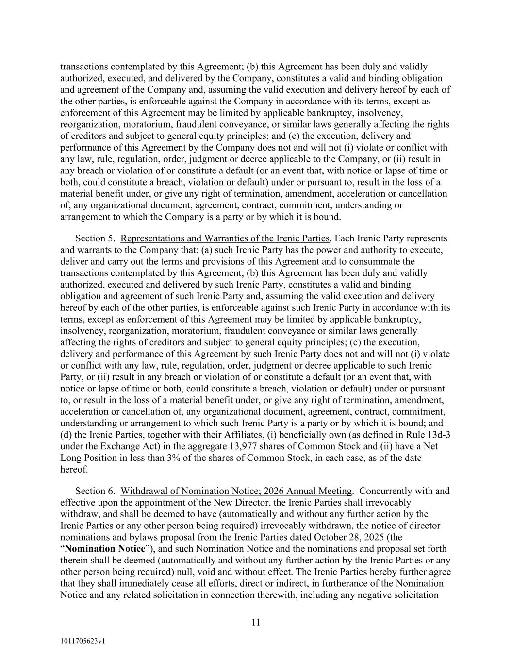 11 1011705623v1 transactions contemplated by this Agreement; (b) this Agreement has been duly and validly authorized, executed, and delivered by the Company, constitutes a valid and binding obligation and agreement of the Company and, assuming the valid execution and delivery hereof by each of the other parties, is enforceable against the Company in accordance with its terms, except as enforcement of this Agreement may be limited by applicable bankruptcy, insolvency, reorganization, moratorium, fraudulent conveyance, or similar laws generally affecting the rights of creditors and subject to general equity principles; and (c) the execution, delivery and performance of this Agreement by the Company does not and will not (i) violate or conflict with any law, rule, regulation, order, judgment or decree applicable to the Company, or (ii) result in any breach or violation of or constitute a default (or an event that, with notice or lapse of time or both, could constitute a breach, violation or default) under or pursuant to, result in the loss of a material benefit under, or give any right of termination, amendment, acceleration or cancellation of, any organizational document, agreement, contract, commitment, understanding or arrangement to which the Company is a party or by which it is bound. Section 5. Representations and Warranties of the Irenic Parties. Each Irenic Party represents and warrants to the Company that: (a) such Irenic Party has the power and authority to execute, deliver and carry out the terms and provisions of this Agreement and to consummate the transactions contemplated by this Agreement; (b) this Agreement has been duly and validly authorized, executed and delivered by such Irenic Party, constitutes a valid and binding obligation and agreement of such Irenic Party and, assuming the valid execution and delivery hereof by each of the other parties, is enforceable against such Irenic Party in accordance with its terms, except as enforcement of this Agreement may be limited by applicable bankruptcy, insolvency, reorganization, moratorium, fraudulent conveyance or similar laws generally affecting the rights of creditors and subject to general equity principles; (c) the execution, delivery and performance of this Agreement by such Irenic Party does not and will not (i) violate or conflict with any law, rule, regulation, order, judgment or decree applicable to such Irenic Party, or (ii) result in any breach or violation of or constitute a default (or an event that, with notice or lapse of time or both, could constitute a breach, violation or default) under or pursuant to, or result in the loss of a material benefit under, or give any right of termination, amendment, acceleration or cancellation of, any organizational document, agreement, contract, commitment, understanding or arrangement to which such Irenic Party is a party or by which it is bound; and (d) the Irenic Parties, together with their Affiliates, (i) beneficially own (as defined in Rule 13d-3 under the Exchange Act) in the aggregate 13,977 shares of Common Stock and (ii) have a Net Long Position in less than 3% of the shares of Common Stock, in each case, as of the date hereof. Section 6. Withdrawal of Nomination Notice; 2026 Annual Meeting. Concurrently with and effective upon the appointment of the New Director, the Irenic Parties shall irrevocably withdraw, and shall be deemed to have (automatically and without any further action by the Irenic Parties or any other person being required) irrevocably withdrawn, the notice of director nominations and bylaws proposal from the Irenic Parties dated October 28, 2025 (the “Nomination Notice”), and such Nomination Notice and the nominations and proposal set forth therein shall be deemed (automatically and without any further action by the Irenic Parties or any other person being required) null, void and without effect. The Irenic Parties hereby further agree that they shall immediately cease all efforts, direct or indirect, in furtherance of the Nomination Notice and any related solicitation in connection therewith, including any negative solicitation