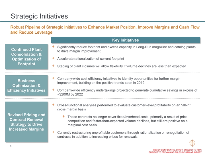Strategic Initiatives Robust Pipeline of Strategic Initiatives to Enhance Market Position, Improve Margins and Cash Flow and Reduce Leverage Key Initiatives + Significantly reduce footprint and excess capacity in Long-Run magazine and catalog plants Continued Plant to drive margin improvement Consolidation & + Accelerate rationalization of current footprint Optimization of Footprint + Staging of plant closures will allow flexibility if volume declines are less than expected + Company-wide cost efficiency initiatives to identify opportunities for further margin Business improvement, building on the positive trends seen in 2019 Optimization & + Company-wide efficiency undertakings projected to generate cumulative savings in excess of Efficiency Initiatives ~$200M by 2022 + Cross-functional analyses performed to evaluate customer-level profitability on an “all-in” gross margin basis Revised Pricing and + These contracts no longer cover fixed/overhead costs, primarily a result of price Contract Renewal competition and faster-than-expected volume declines, but still are positive on a Strategy to Drive marginal cost basis Increased Margins + Currently restructuring unprofitable customers through rationalization or renegotiation of contracts in addition to increasing prices for renewals 6 HIGHLY CONFIDENTIAL DRAFT, SUBJECT TO NDA; SUBJECT TO FRE 408 AND RULES OF SIMILAR IMPORTStrategic Initiatives Robust Pipeline of Strategic Initiatives to Enhance Market Position, Improve Margins and Cash Flow and Reduce Leverage Key Initiatives + Significantly reduce footprint and excess capacity in Long-Run magazine and catalog plants Continued Plant to drive margin improvement Consolidation & + Accelerate rationalization of current footprint Optimization of Footprint + Staging of plant closures will allow flexibility if volume declines are less than expected + Company-wide cost efficiency initiatives to identify opportunities for further margin Business improvement, building on the positive trends seen in 2019 Optimization & + Company-wide efficiency undertakings projected to generate cumulative savings in excess of Efficiency Initiatives ~$200M by 2022 + Cross-functional analyses performed to evaluate customer-level profitability on an “all-in” gross margin basis Revised Pricing and + These contracts no longer cover fixed/overhead costs, primarily a result of price Contract Renewal competition and faster-than-expected volume declines, but still are positive on a Strategy to Drive marginal cost basis Increased Margins + Currently restructuring unprofitable customers through rationalization or renegotiation of contracts in addition to increasing prices for renewals 6 HIGHLY CONFIDENTIAL DRAFT, SUBJECT TO NDA; SUBJECT TO FRE 408 AND RULES OF SIMILAR IMPORT