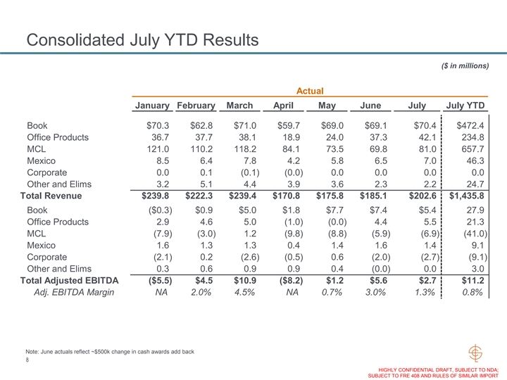 Consolidated July 2020 Results ($ in millions) Actual Forecast July Δ + On a consolidated basis, July results exceeded the revised revenue and EBITDA July July $ % forecasts as volumes continued to show Book $70.4 $75.4 ($5.0) (6.6%) month over month growth from April lows, in addition to better than expected Office Products 42.1 40.8 1.3 3.1% productivity and ongoing cost savings. Key MCL 81.0 75.3 5.7 7.5% drivers of the July MTD results vs. forecast Mexico 7.0 7.2 (0.2) (3.1%) are as follows: Corporate 0.0 - 0.0 na Other and Elims 2.2 2.7 (0.4) (16.3%) + MCL: July MTD favorable revenue and EBITDA primarily driven by Total Revenue $202.6 $201.3 $1.3 0.6% higher sales volume in Catalog and Book $5.4 $5.5 ($0.2) (2.8%) Co-Services, in addition to favorable Office Products 5.5 5.2 0.3 5.5% productivity and ongoing cost control MCL (6.9) (11.0) 4.1 37.7% measures across the Segment Mexico 1.4 1.4 0.1 6.4% + Book: July MTD revenue miss Corporate (2.7) (2.8) 0.0 0.9% primarily driven by a combination of Other and Elims 0.0 (0.3) 0.3 108.6% timing of sales and mix of work. Total Adjusted EBITDA $2.7 ($2.0) $4.7 238.8% Higher VAR per unit (favorable mix), Adj. EBITDA Margin 1.3% NA favorable cost control, and productivity mitigated EBITDA impact 7 HIGHLY CONFIDENTIAL DRAFT, SUBJECT TO NDA; SUBJECT TO FRE 408 AND RULES OF SIMILAR IMPORTConsolidated July 2020 Results ($ in millions) Actual Forecast July Δ + On a consolidated basis, July results exceeded the revised revenue and EBITDA July July $ % forecasts as volumes continued to show Book $70.4 $75.4 ($5.0) (6.6%) month over month growth from April lows, in addition to better than expected Office Products 42.1 40.8 1.3 3.1% productivity and ongoing cost savings. Key MCL 81.0 75.3 5.7 7.5% drivers of the July MTD results vs. forecast Mexico 7.0 7.2 (0.2) (3.1%) are as follows: Corporate 0.0 - 0.0 na Other and Elims 2.2 2.7 (0.4) (16.3%) + MCL: July MTD favorable revenue and EBITDA primarily driven by Total Revenue $202.6 $201.3 $1.3 0.6% higher sales volume in Catalog and Book $5.4 $5.5 ($0.2) (2.8%) Co-Services, in addition to favorable Office Products 5.5 5.2 0.3 5.5% productivity and ongoing cost control MCL (6.9) (11.0) 4.1 37.7% measures across the Segment Mexico 1.4 1.4 0.1 6.4% + Book: July MTD revenue miss Corporate (2.7) (2.8) 0.0 0.9% primarily driven by a combination of Other and Elims 0.0 (0.3) 0.3 108.6% timing of sales and mix of work. Total Adjusted EBITDA $2.7 ($2.0) $4.7 238.8% Higher VAR per unit (favorable mix), Adj. EBITDA Margin 1.3% NA favorable cost control, and productivity mitigated EBITDA impact 7 HIGHLY CONFIDENTIAL DRAFT, SUBJECT TO NDA; SUBJECT TO FRE 408 AND RULES OF SIMILAR IMPORT