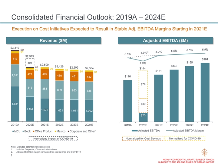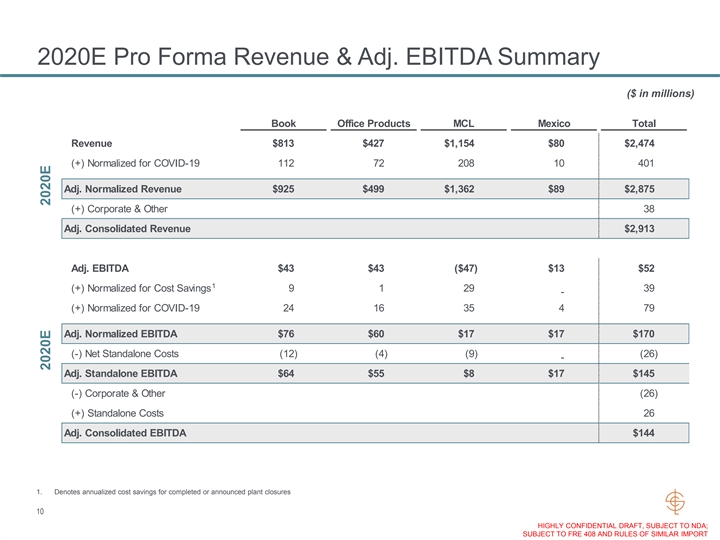 Consolidated Financial Outlook: 2019A – 2024E Execution on Cost Initiatives Expected to Result in Stable Adj. EBITDA Margins Starting in 2021E Revenue ($M) Adjusted EBITDA ($M) $3,310 6.9% 59 6.5% 6.0% 5.2% 91 2 4.9% 3.5% $2,913 517 $164 $155 401 1.0% $2,509 $145 $2,429 38 $2,396 $2,364 $144 79 80 80 $131 80 81 469 427 1,011 460 451 $116 442 $79 813 888 869 853 838 1,631 $39 1,154 1,073 1,021 1,011 1,002 $25 2019A 2020E 2021E 2022E 2023E 2024E 2019A 2020E 2021E 2022E 2023E 2024E 1 Adjusted EBITDA Adjusted EBITDA Margin MCL Book Office Product Mexico Corporate and Other Normalized for Cost Savings Normalized for COVID-19 Normalized Impact of COVID-19 Note: Excludes potential standalone costs 1. Includes Corporate, Other and eliminations 2. Adjusted EBITDA margin normalized for cost savings and COVID-19 9 HIGHLY CONFIDENTIAL DRAFT, SUBJECT TO NDA; SUBJECT TO FRE 408 AND RULES OF SIMILAR IMPORTConsolidated Financial Outlook: 2019A – 2024E Execution on Cost Initiatives Expected to Result in Stable Adj. EBITDA Margins Starting in 2021E Revenue ($M) Adjusted EBITDA ($M) $3,310 6.9% 59 6.5% 6.0% 5.2% 91 2 4.9% 3.5% $2,913 517 $164 $155 401 1.0% $2,509 $145 $2,429 38 $2,396 $2,364 $144 79 80 80 $131 80 81 469 427 1,011 460 451 $116 442 $79 813 888 869 853 838 1,631 $39 1,154 1,073 1,021 1,011 1,002 $25 2019A 2020E 2021E 2022E 2023E 2024E 2019A 2020E 2021E 2022E 2023E 2024E 1 Adjusted EBITDA Adjusted EBITDA Margin MCL Book Office Product Mexico Corporate and Other Normalized for Cost Savings Normalized for COVID-19 Normalized Impact of COVID-19 Note: Excludes potential standalone costs 1. Includes Corporate, Other and eliminations 2. Adjusted EBITDA margin normalized for cost savings and COVID-19 9 HIGHLY CONFIDENTIAL DRAFT, SUBJECT TO NDA; SUBJECT TO FRE 408 AND RULES OF SIMILAR IMPORT