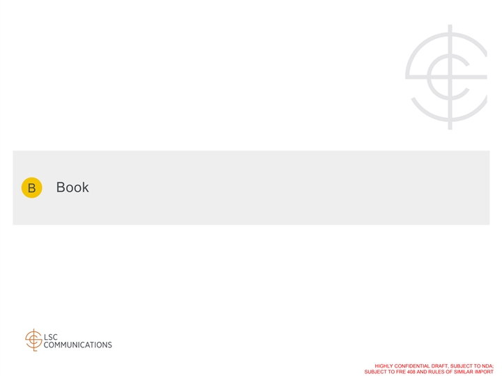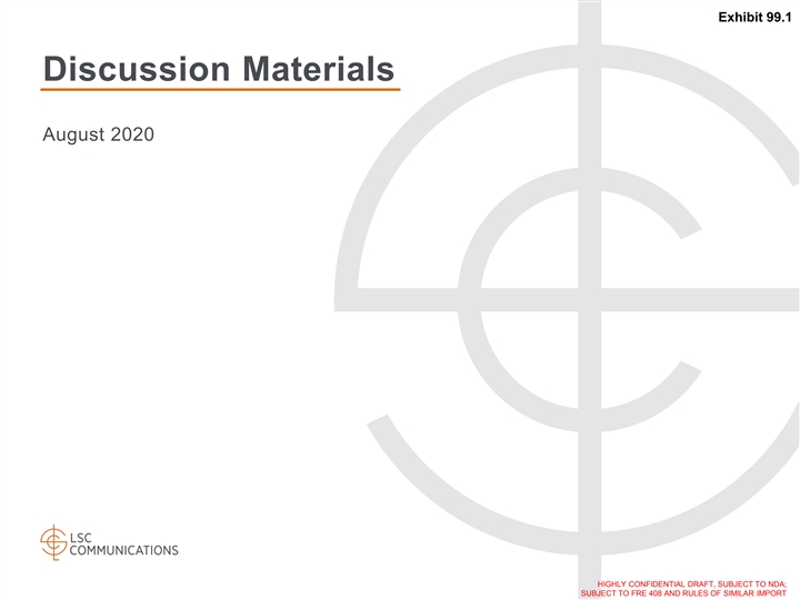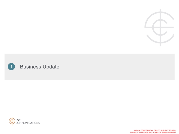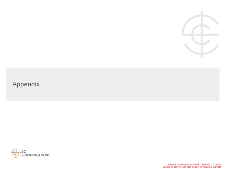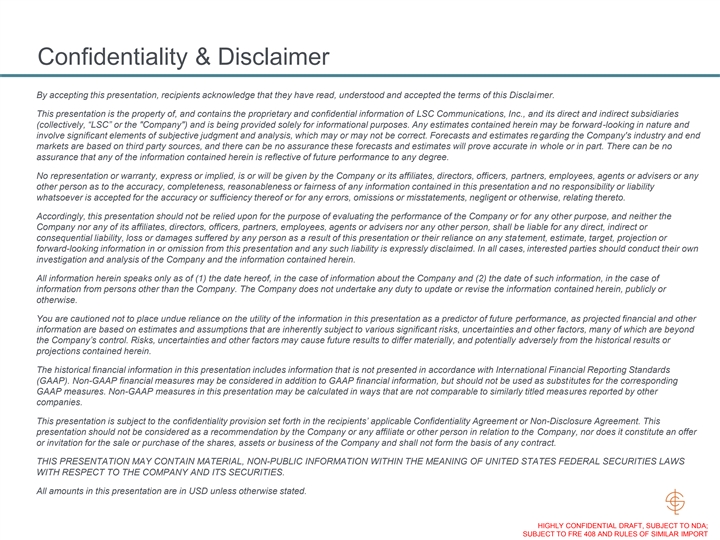Confidentiality & Disclaimer By accepting this presentation, recipients acknowledge that they have read, understood and accepted the terms of this Disclaimer. This presentation is the property of, and contains the proprietary and confidential information of LSC Communications, Inc., and its direct and indirect subsidiaries (collectively, “LSC” or the Company ) and is being provided solely for informational purposes. Any estimates contained herein may be forward-looking in nature and involve significant elements of subjective judgment and analysis, which may or may not be correct. Forecasts and estimates regarding the Company's industry and end markets are based on third party sources, and there can be no assurance these forecasts and estimates will prove accurate in whole or in part. There can be no assurance that any of the information contained herein is reflective of future performance to any degree. No representation or warranty, express or implied, is or will be given by the Company or its affiliates, directors, officers, partners, employees, agents or advisers or any other person as to the accuracy, completeness, reasonableness or fairness of any information contained in this presentation and no responsibility or liability whatsoever is accepted for the accuracy or sufficiency thereof or for any errors, omissions or misstatements, negligent or otherwise, relating thereto. Accordingly, this presentation should not be relied upon for the purpose of evaluating the performance of the Company or for any other purpose, and neither the Company nor any of its affiliates, directors, officers, partners, employees, agents or advisers nor any other person, shall be liable for any direct, indirect or consequential liability, loss or damages suffered by any person as a result of this presentation or their reliance on any statement, estimate, target, projection or forward-looking information in or omission from this presentation and any such liability is expressly disclaimed. In all cases, interested parties should conduct their own investigation and analysis of the Company and the information contained herein. All information herein speaks only as of (1) the date hereof, in the case of information about the Company and (2) the date of such information, in the case of information from persons other than the Company. The Company does not undertake any duty to update or revise the information contained herein, publicly or otherwise. You are cautioned not to place undue reliance on the utility of the information in this presentation as a predictor of future performance, as projected financial and other information are based on estimates and assumptions that are inherently subject to various significant risks, uncertainties and other factors, many of which are beyond the Company’s control. Risks, uncertainties and other factors may cause future results to differ materially, and potentially adversely from the historical results or projections contained herein. The historical financial information in this presentation includes information that is not presented in accordance with International Financial Reporting Standards (GAAP). Non-GAAP financial measures may be considered in addition to GAAP financial information, but should not be used as substitutes for the corresponding GAAP measures. Non-GAAP measures in this presentation may be calculated in ways that are not comparable to similarly titled measures reported by other companies. This presentation is subject to the confidentiality provision set forth in the recipients’ applicable Confidentiality Agreement or Non-Disclosure Agreement. This presentation should not be considered as a recommendation by the Company or any affiliate or other person in relation to the Company, nor does it constitute an offer or invitation for the sale or purchase of the shares, assets or business of the Company and shall not form the basis of any contract. THIS PRESENTATION MAY CONTAIN MATERIAL, NON-PUBLIC INFORMATION WITHIN THE MEANING OF UNITED STATES FEDERAL SECURITIES LAWS WITH RESPECT TO THE COMPANY AND ITS SECURITIES. All amounts in this presentation are in USD unless otherwise stated. HIGHLY CONFIDENTIAL DRAFT, SUBJECT TO NDA; SUBJECT TO FRE 408 AND RULES OF SIMILAR IMPORTConfidentiality & Disclaimer By accepting this presentation, recipients acknowledge that they have read, understood and accepted the terms of this Disclaimer. This presentation is the property of, and contains the proprietary and confidential information of LSC Communications, Inc., and its direct and indirect subsidiaries (collectively, “LSC” or the Company ) and is being provided solely for informational purposes. Any estimates contained herein may be forward-looking in nature and involve significant elements of subjective judgment and analysis, which may or may not be correct. Forecasts and estimates regarding the Company's industry and end markets are based on third party sources, and there can be no assurance these forecasts and estimates will prove accurate in whole or in part. There can be no assurance that any of the information contained herein is reflective of future performance to any degree. No representation or warranty, express or implied, is or will be given by the Company or its affiliates, directors, officers, partners, employees, agents or advisers or any other person as to the accuracy, completeness, reasonableness or fairness of any information contained in this presentation and no responsibility or liability whatsoever is accepted for the accuracy or sufficiency thereof or for any errors, omissions or misstatements, negligent or otherwise, relating thereto. Accordingly, this presentation should not be relied upon for the purpose of evaluating the performance of the Company or for any other purpose, and neither the Company nor any of its affiliates, directors, officers, partners, employees, agents or advisers nor any other person, shall be liable for any direct, in