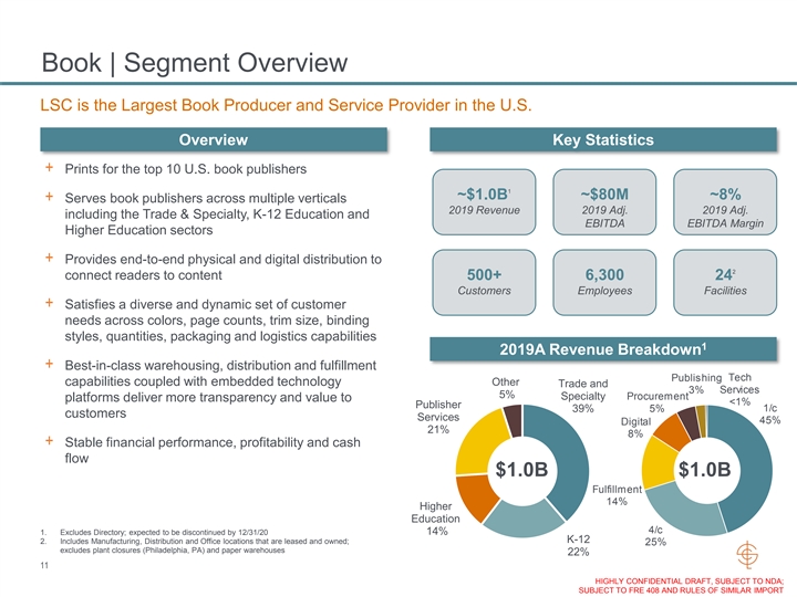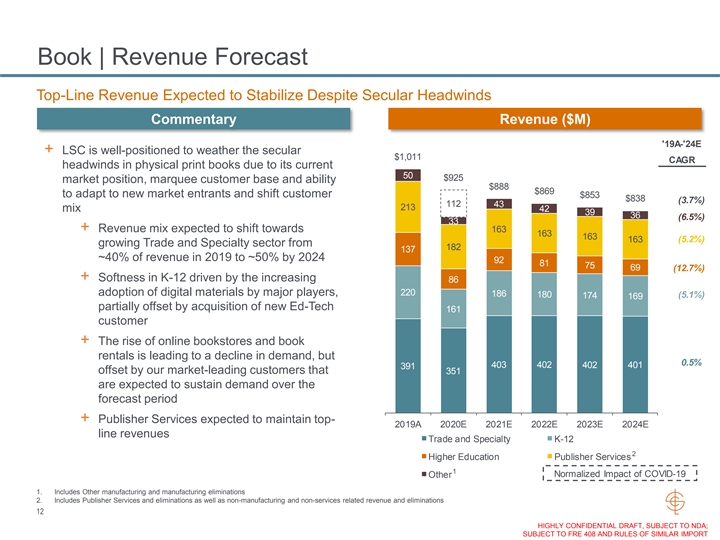 Book | Segment Overview LSC is the Largest Book Producer and Service Provider in the U.S. Overview Key Statistics + Prints for the top 10 U.S. book publishers 1 ~$1.0B ~$80M ~8% + Serves book publishers across multiple verticals 2019 Revenue 2019 Adj. 2019 Adj. including the Trade & Specialty, K-12 Education and EBITDA EBITDA Margin Higher Education sectors + Provides end-to-end physical and digital distribution to 2 connect readers to content 500+ 6,300 24 Customers Employees Facilities + Satisfies a diverse and dynamic set of customer needs across colors, page counts, trim size, binding styles, quantities, packaging and logistics capabilities 1 2019A Revenue Breakdown + Best-in-class warehousing, distribution and fulfillment Publishing Tech capabilities coupled with embedded technology Other Trade and 3% Services 5% Specialty Procurement platforms deliver more transparency and value to <1% Publisher 1/c 39% 5% customers Services 45% Digital 21% 8% + Stable financial performance, profitability and cash flow $1.0B $1.0B Fulfillment 14% Higher Education 4/c 1. Excludes Directory; expected to be discontinued by 12/31/20 14% K-12 2. Includes Manufacturing, Distribution and Office locations that are leased and owned; 25% excludes plant closures (Philadelphia, PA) and paper warehouses 22% 11 HIGHLY CONFIDENTIAL DRAFT, SUBJECT TO NDA; SUBJECT TO FRE 408 AND RULES OF SIMILAR IMPORTBook | Segment Overview LSC is the Largest Book Producer and Service Provider in the U.S. Overview Key Statistics + Prints for the top 10 U.S. book publishers 1 ~$1.0B ~$80M ~8% + Serves book publishers across multiple verticals 2019 Revenue 2019 Adj. 2019 Adj. including the Trade & Specialty, K-12 Education and EBITDA EBITDA Margin Higher Education sectors + Provides end-to-end physical and digital distribution to 2 connect readers to content 500+ 6,300 24 Customers Employees Facilities + Satisfies a diverse and dynamic set of customer needs across colors, page counts, trim size, binding styles, quantities, packaging and logistics capabilities 1 2019A Revenue Breakdown + Best-in-class warehousing, distribution and fulfillment Publishing Tech capabilities coupled with embedded technology Other Trade and 3% Services 5% Specialty Procurement platforms deliver more transparency and value to <1% Publisher 1/c 39% 5% customers Services 45% Digital 21% 8% + Stable financial performance, profitability and cash flow $1.0B $1.0B Fulfillment 14% Higher Education 4/c 1. Excludes Directory; expected to be discontinued by 12/31/20 14% K-12 2. Includes Manufacturing, Distribution and Office locations that are leased and owned; 25% excludes plant closures (Philadelphia, PA) and paper warehouses 22% 11 HIGHLY CONFIDENTIAL DRAFT, SUBJECT TO NDA; SUBJECT TO FRE 408 AND RULES OF SIMILAR IMPORT