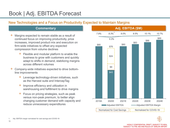 Book | Adj. EBITDA Forecast New Technologies and a Focus on Productivity Expected to Maintain Margins Commentary Adj. EBITDA ($M) 1 7.9% 8.3% 9.0% 9.5% 10.1% 10.7% + Margins expected to remain stable as a result of $89 5.3% continued focus on improving productivity, price $86 increases, improved product mix and execution on $83 $80 $80 firm-wide initiatives to offset any expected $76 compression from volume declines + Flexible and modular platform to enable the $24 business to grow with customers and quickly adapt to shifts in demand, stabilizing margins across different volumes $9 + Company-wide initiatives expected to drive bottom- $43 line improvements + Leverage technology-driven initiatives, such as the Harvest suite and IntercepTag + Improve efficiency and utilization in warehousing and fulfillment to drive margins + Focus on pricing strategies, such as peak versus non-peak premium, to better align changing customer demand with capacity and 2019A 2020E 2021E 2022E 2023E 2024E reduce unnecessary expenditures Adjusted EBITDA Adjusted EBITDA Margin Normalized for Cost Savings Normalized for COVID-19 1. Adj. EBITDA margin normalized for cost savings and COVID-19 13 HIGHLY CONFIDENTIAL DRAFT, SUBJECT TO NDA; SUBJECT TO FRE 408 AND RULES OF SIMILAR IMPORTBook | Adj. EBITDA Forecast New Technologies and a Focus on Productivity Expected to Maintain Margins Commentary Adj. EBITDA ($M) 1 7.9% 8.3% 9.0% 9.5% 10.1% 10.7% + Margins expected to remain stable as a result of $89 5.3% continued focus on improving productivity, price $86 increases, improved product mix and execution on $83 $80 $80 firm-wide initiatives to offset any expected $76 compression from volume declines + Flexible and modular platform to enable the $24 business to grow with customers and quickly adapt to shifts in demand, stabilizing margins across different volumes $9 + Company-wide initiatives expected to drive bottom- $43 line improvements + Leverage technology-driven initiatives, such as the Harvest suite and IntercepTag + Improve efficiency and utilization in warehousing and fulfillment to drive margins + Focus on pricing strategies, such as peak versus non-peak premium, to better align changing customer demand with capacity and 2019A 2020E 2021E 2022E 2023E 2024E reduce unnecessary expenditures Adjusted EBITDA Adjusted EBITDA Margin Normalized for Cost Savings Normalized for COVID-19 1. Adj. EBITDA margin normalized for cost savings and COVID-19 13 HIGHLY CONFIDENTIAL DRAFT, SUBJECT TO NDA; SUBJECT TO FRE 408 AND RULES OF SIMILAR IMPORT