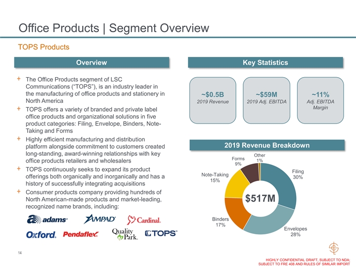 Office Products | Segment Overview TOPS Products Overview Key Statistics + The Office Products segment of LSC Communications (“TOPS”), is an industry leader in the manufacturing of office products and stationery in ~$0.5B ~$59M ~11% North America 2019 Revenue 2019 Adj. EBITDA Adj. EBITDA Margin + TOPS offers a variety of branded and private label office products and organizational solutions in five product categories: Filing, Envelope, Binders, Note- Taking and Forms + Highly efficient manufacturing and distribution 2019 Revenue Breakdown platform alongside commitment to customers created long-standing, award-winning relationships with key Other Forms 1% office products retailers and wholesalers 9% + TOPS continuously seeks to expand its product Filing Note-Taking offerings both organically and inorganically and has a 30% 15% history of successfully integrating acquisitions + Consumer products company providing hundreds of North American-made products and market-leading, $517M recognized name brands, including: Binders 17% Envelopes 28% 14 HIGHLY CONFIDENTIAL DRAFT, SUBJECT TO NDA; SUBJECT TO FRE 408 AND RULES OF SIMILAR IMPORTOffice Products | Segment Overview TOPS Products Overview Key Statistics + The Office Products segment of LSC Communications (“TOPS”), is an industry leader in the manufacturing of office products and stationery in ~$0.5B ~$59M ~11% North America 2019 Revenue 2019 Adj. EBITDA Adj. EBITDA Margin + TOPS offers a variety of branded and private label office products and organizational solutions in five product categories: Filing, Envelope, Binders, Note- Taking and Forms + Highly efficient manufacturing and distribution 2019 Revenue Breakdown platform alongside commitment to customers created long-standing, award-winning relationships with key Other Forms 1% office products retailers and wholesalers 9% + TOPS continuously seeks to expand its product Filing Note-Taking offerings both organically and inorganically and has a 30% 15% history of successfully integrating acquisitions + Consumer products company providing hundreds of North American-made products and market-leading, $517M recognized name brands, including: Binders 17% Envelopes 28% 14 HIGHLY CONFIDENTIAL DRAFT, SUBJECT TO NDA; SUBJECT TO FRE 408 AND RULES OF SIMILAR IMPORT