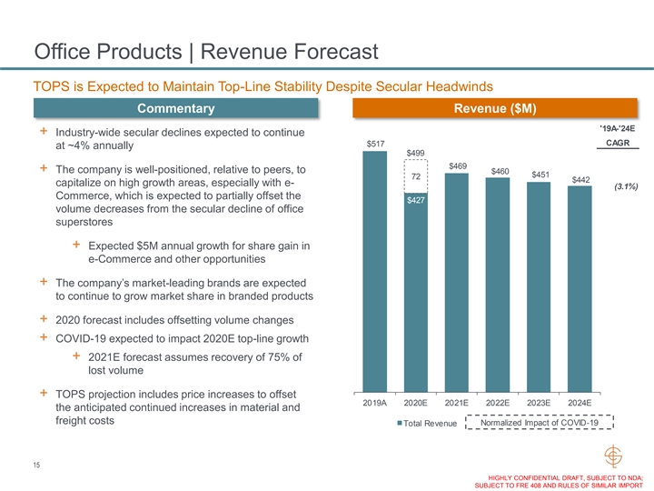 Office Products | Revenue Forecast TOPS is Expected to Maintain Top-Line Stability Despite Secular Headwinds Commentary Revenue ($M) '19A-'24E + Industry-wide secular declines expected to continue CAGR $517 at ~4% annually $499 $469 + The company is well-positioned, relative to peers, to $460 $451 72 $442 capitalize on high growth areas, especially with e- (3.1%) Commerce, which is expected to partially offset the $427 volume decreases from the secular decline of office superstores + Expected $5M annual growth for share gain in e-Commerce and other opportunities + The company’s market-leading brands are expected to continue to grow market share in branded products + 2020 forecast includes offsetting volume changes + COVID-19 expected to impact 2020E top-line growth + 2021E forecast assumes recovery of 75% of lost volume + TOPS projection includes price increases to offset 2019A 2020E 2021E 2022E 2023E 2024E the anticipated continued increases in material and freight costs Normalized Impact of COVID-19 Total Revenue 15 HIGHLY CONFIDENTIAL DRAFT, SUBJECT TO NDA; SUBJECT TO FRE 408 AND RULES OF SIMILAR IMPORTOffice Products | Revenue Forecast TOPS is Expected to Maintain Top-Line Stability Despite Secular Headwinds Commentary Revenue ($M) '19A-'24E + Industry-wide secular declines expected to continue CAGR $517 at ~4% annually $499 $469 + The company is well-positioned, relative to peers, to $460 $451 72 $442 capitalize on high growth areas, especially with e- (3.1%) Commerce, which is expected to partially offset the $427 volume decreases from the secular decline of office superstores + Expected $5M annual growth for share gain in e-Commerce and other opportunities + The company’s market-leading brands are expected to continue to grow market share in branded products + 2020 forecast includes offsetting volume changes + COVID-19 expected to impact 2020E top-line growth + 2021E forecast assumes recovery of 75% of lost volume + TOPS projection includes price increases to offset 2019A 2020E 2021E 2022E 2023E 2024E the anticipated continued increases in material and freight costs Normalized Impact of COVID-19 Total Revenue 15 HIGHLY CONFIDENTIAL DRAFT, SUBJECT TO NDA; SUBJECT TO FRE 408 AND RULES OF SIMILAR IMPORT