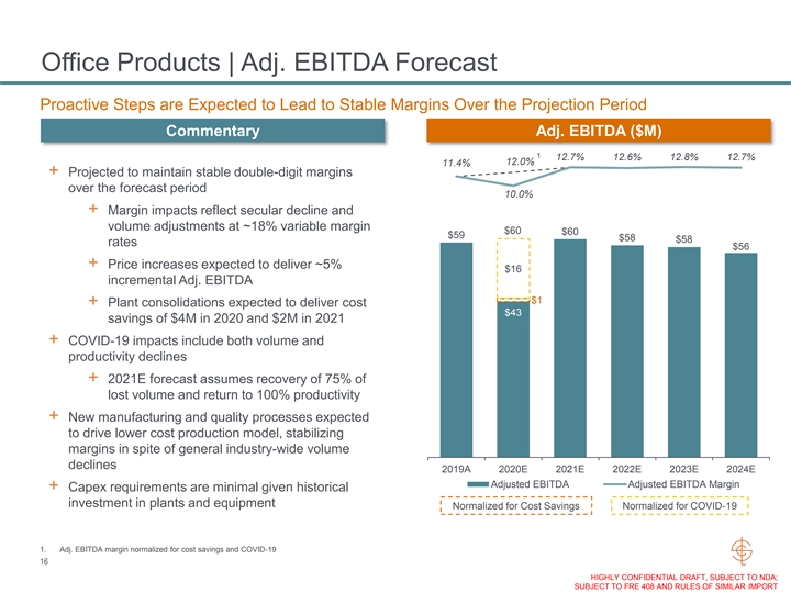 Office Products | Adj. EBITDA Forecast Proactive Steps are Expected to Lead to Stable Margins Over the Projection Period Commentary Adj. EBITDA ($M) 1 12.7% 12.6% 12.8% 12.7% 12.0% 11.4% + Projected to maintain stable double-digit margins over the forecast period 10.0% + Margin impacts reflect secular decline and volume adjustments at ~18% variable margin $60 $60 $59 $58 $58 rates $56 + Price increases expected to deliver ~5% $16 incremental Adj. EBITDA $1 + Plant consolidations expected to deliver cost $43 savings of $4M in 2020 and $2M in 2021 + COVID-19 impacts include both volume and productivity declines + 2021E forecast assumes recovery of 75% of lost volume and return to 100% productivity + New manufacturing and quality processes expected to drive lower cost production model, stabilizing margins in spite of general industry-wide volume declines 2019A 2020E 2021E 2022E 2023E 2024E Adjusted EBITDA Adjusted EBITDA Margin + Capex requirements are minimal given historical investment in plants and equipment Normalized for Cost Savings Normalized for COVID-19 1. Adj. EBITDA margin normalized for cost savings and COVID-19 16 HIGHLY CONFIDENTIAL DRAFT, SUBJECT TO NDA; SUBJECT TO FRE 408 AND RULES OF SIMILAR IMPORTOffice Products | Adj. EBITDA Forecast Proactive Steps are Expected to Lead to Stable Margins Over the Projection Period Commentary Adj. EBITDA ($M) 1 12.7% 12.6% 12.8% 12.7% 12.0% 11.4% + Projected to maintain stable double-digit margins over the forecast period 10.0% + Margin impacts reflect secular decline and volume adjustments at ~18% variable margin $60 $60 $59 $58 $58 rates $56 + Price increases expected to deliver ~5% $16 incremental Adj. EBITDA $1 + Plant consolidations expected to deliver cost $43 savings of $4M in 2020 and $2M in 2021 + COVID-19 impacts include both volume and productivity declines + 2021E forecast assumes recovery of 75% of lost volume and return to 100% productivity + New manufacturing and quality processes expected to drive lower cost production model, stabilizing margins in spite of general industry-wide volume declines 2019A 2020E 2021E 2022E 2023E 2024E Adjusted EBITDA Adjusted EBITDA Margin + Capex requirements are minimal given historical investment in plants and equipment Normalized for Cost Savings Normalized for COVID-19 1. Adj. EBITDA margin normalized for cost savings and COVID-19 16 HIGHLY CONFIDENTIAL DRAFT, SUBJECT TO NDA; SUBJECT TO FRE 408 AND RULES OF SIMILAR IMPORT