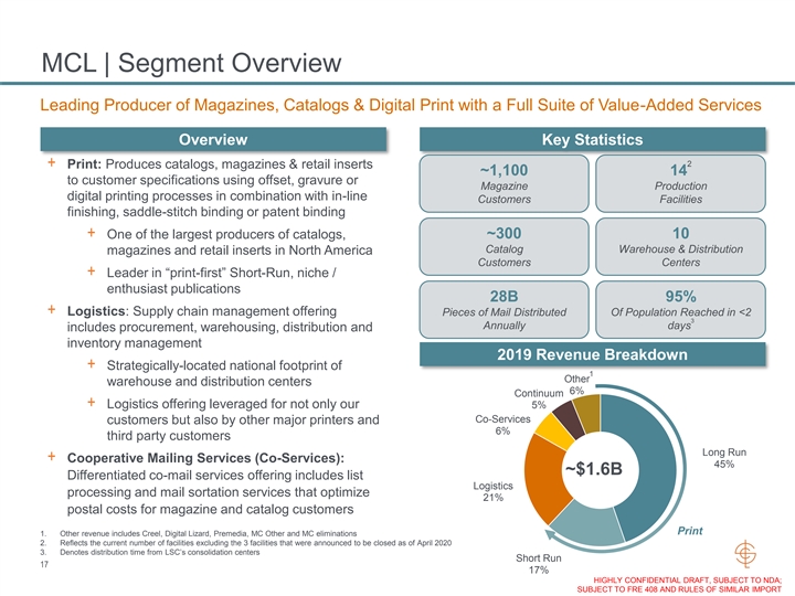 MCL | Segment Overview Leading Producer of Magazines, Catalogs & Digital Print with a Full Suite of Value-Added Services Overview Key Statistics 2 + Print: Produces catalogs, magazines & retail inserts ~1,100 14 to customer specifications using offset, gravure or Magazine Production digital printing processes in combination with in-line Customers Facilities finishing, saddle-stitch binding or patent binding + One of the largest producers of catalogs, ~300 10 Catalog Warehouse & Distribution magazines and retail inserts in North America Customers Centers + Leader in “print-first” Short-Run, niche / enthusiast publications 28B 95% + Logistics: Supply chain management offering Pieces of Mail Distributed Of Population Reached in <2 3 Annually days includes procurement, warehousing, distribution and inventory management 2019 Revenue Breakdown + Strategically-located national footprint of 1 Other warehouse and distribution centers 6% Continuum + Logistics offering leveraged for not only our 5% Co-Services customers but also by other major printers and 6% third party customers Long Run + Cooperative Mailing Services (Co-Services): 45% ~$1.6B Differentiated co-mail services offering includes list Logistics processing and mail sortation services that optimize 21% postal costs for magazine and catalog customers Print 1. Other revenue includes Creel, Digital Lizard, Premedia, MC Other and MC eliminations 2. Reflects the current number of facilities excluding the 3 facilities that were announced to be closed as of April 2020 3. Denotes distribution time from LSC’s consolidation centers Short Run 17 17% HIGHLY CONFIDENTIAL DRAFT, SUBJECT TO NDA; SUBJECT TO FRE 408 AND RULES OF SIMILAR IMPORTMCL | Segment Overview Leading Producer of Magazines, Catalogs & Digital Print with a Full Suite of Value-Added Services Overview Key Statistics 2 + Print: Produces catalogs, magazines & retail inserts ~1,100 14 to customer specifications using offset, gravure or Magazine Production digital printing processes in combination with in-line Customers Facilities finishing, saddle-stitch binding or patent binding + One of the largest producers of catalogs, ~300 10 Catalog Warehouse & Distribution magazines and retail inserts in North America Customers Centers + Leader in “print-first” Short-Run, niche / enthusiast publications 28B 95% + Logistics: Supply chain management offering Pieces of Mail Distributed Of Population Reached in <2 3 Annually days includes procurement, warehousing, distribution and inventory management 2019 Revenue Breakdown + Strategically-located national footprint of 1 Other warehouse and distribution centers 6% Continuum + Logistics offering leveraged for not only our 5% Co-Services customers but also by other major printers and 6% third party customers Long Run + Cooperative Mailing Services (Co-Services): 45% ~$1.6B Differentiated co-mail services offering includes list Logistics processing and mail sortation services that optimize 21% postal costs for magazine and catalog customers Print 1. Other revenue includes Creel, Digital Lizard, Premedia, MC Other and MC eliminations 2. Reflects the current number of facilities excluding the 3 facilities that were announced to be closed as of April 2020 3. Denotes distribution time from LSC’s consolidation centers Short Run 17 17% HIGHLY CONFIDENTIAL DRAFT, SUBJECT TO NDA; SUBJECT TO FRE 408 AND RULES OF SIMILAR IMPORT
