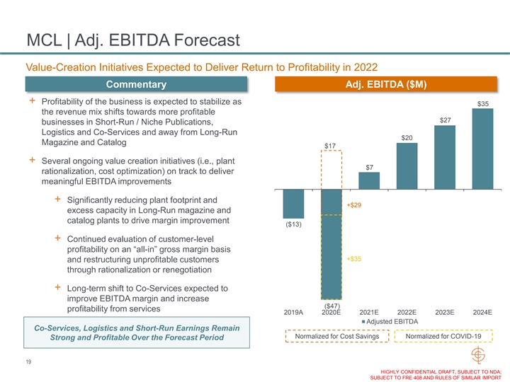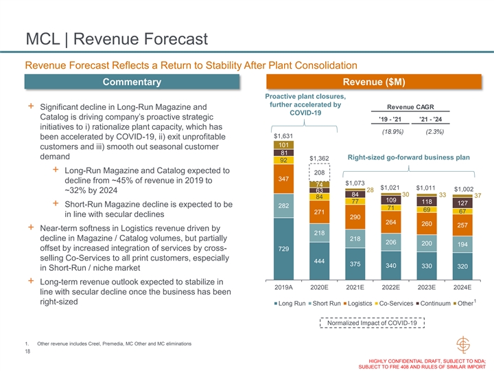 MCL | Revenue Forecast Revenue Forecast Reflects a Return to Stability After Plant Consolidation Commentary Revenue ($M) Proactive plant closures, further accelerated by Revenue CAGR + Significant decline in Long-Run Magazine and COVID-19 Catalog is driving company’s proactive strategic '19 - '21 '21 - '24 initiatives to i) rationalize plant capacity, which has (18.9%) (2.3%) $1,631 been accelerated by COVID-19, ii) exit unprofitable 101 customers and iii) smooth out seasonal customer 81 demand Right-sized go-forward business plan $1,362 92 + Long-Run Magazine and Catalog expected to 208 347 decline from ~45% of revenue in 2019 to $1,073 74 $1,021 $1,011 $1,002 28 ~32% by 2024 63 84 30 33 37 84 109 77 118 127 + Short-Run Magazine decline is expected to be 282 71 69 67 271 in line with secular declines 290 264 260 257 + Near-term softness in Logistics revenue driven by 218 decline in Magazine / Catalog volumes, but partially 218 206 200 194 offset by increased integration of services by cross- 729 selling Co-Services to all print customers, especially 444 375 340 330 320 in Short-Run / niche market + Long-term revenue outlook expected to stabilize in 2019A 2020E 2021E 2022E 2023E 2024E line with secular decline once the business has been 1 right-sized Long Run Short Run Logistics Co-Services Continuum Other Normalized Impact of COVID-19 1. Other revenue includes Creel, Premedia, MC Other and MC eliminations 18 HIGHLY CONFIDENTIAL DRAFT, SUBJECT TO NDA; SUBJECT TO FRE 408 AND RULES OF SIMILAR IMPORTMCL | Revenue Forecast Revenue Forecast Reflects a Return to Stability After Plant Consolidation Commentary Revenue ($M) Proactive plant closures, further accelerated by Revenue CAGR + Significant decline in Long-Run Magazine and COVID-19 Catalog is driving company’s proactive strategic '19 - '21 '21 - '24 initiatives to i) rationalize plant capacity, which has (18.9%) (2.3%) $1,631 been accelerated by COVID-19, ii) exit unprofitable 101 customers and iii) smooth out seasonal customer 81 demand Right-sized go-forward business plan $1,362 92 + Long-Run Magazine and Catalog expected to 208 347 decline from ~45% of revenue in 2019 to $1,073 74 $1,021 $1,011 $1,002 28 ~32% by 2024 63 84 30 33 37 84 109 77 118 127 + Short-Run Magazine decline is expected to be 282 71 69 67 271 in line with secular declines 290 264 260 257 + Near-term softness in Logistics revenue driven by 218 decline in Magazine / Catalog volumes, but partially 218 206 200 194 offset by increased integration of services by cross- 729 selling Co-Services to all print customers, especially 444 375 340 330 320 in Short-Run / niche market + Long-term revenue outlook expected to stabilize in 2019A 2020E 2021E 2022E 2023E 2024E line with secular decline once the business has been 1 right-sized Long Run Short Run Logistics Co-Services Continuum Other Normalized Impact of COVID-19 1. Other revenue includes Creel, Premedia, MC Other and MC eliminations 18 HIGHLY CONFIDENTIAL DRAFT, SUBJECT TO NDA; SUBJECT TO FRE 408 AND RULES OF SIMILAR IMPORT