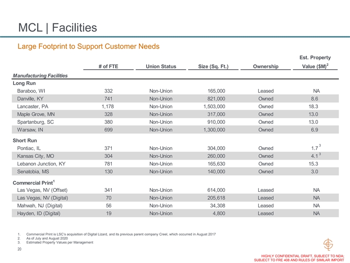 MCL | Facilities Large Footprint to Support Customer Needs Est. Property 2 # of FTE Union Status Size (Sq. Ft.) Ownership Value ($M) Manufacturing Facilities Long Run Baraboo, WI 332 Non-Union 165,000 Leased NA Danville, KY 741 Non-Union 821,000 Owned 8.6 Lancaster, PA 1,178 Non-Union 1,503,000 Owned 18.3 Maple Grove, MN 328 Non-Union 317,000 Owned 13.0 Spartanburg, SC 380 Non-Union 910,000 Owned 13.0 Warsaw, IN 699 Non-Union 1,300,000 Owned 6.9 Short Run 3 Pontiac, IL 371 Non-Union 304,000 Owned 1.7 3 Kansas City, MO 304 Non-Union 260,000 Owned 4.1 Lebanon Junction, KY 781 Non-Union 165,630 Owned 15.3 Senatobia, MS 130 Non-Union 140,000 Owned 3.0 1 Commercial Print Las Vegas, NV (Offset) 341 Non-Union 614,000 Leased NA Las Vegas, NV (Digital) 70 Non-Union 205,618 Leased NA Mahwah, NJ (Digital) 56 Non-Union 34,308 Leased NA Hayden, ID (Digital) 19 Non-Union 4,800 Leased NA 1. Commercial Print is LSC’s acquisition of Digital Lizard, and its previous parent company Creel, which occurred in August 2017 2. As of July and August 2020 3. Estimated Property Values per Management 20 HIGHLY CONFIDENTIAL DRAFT, SUBJECT TO NDA; SUBJECT TO FRE 408 AND RULES OF SIMILAR IMPORTMCL | Facilities Large Footprint to Support Customer Needs Est. Property 2 # of FTE Union Status Size (Sq. Ft.) Ownership Value ($M) Manufacturing Facilities Long Run Baraboo, WI 332 Non-Union 165,000 Leased NA Danville, KY 741 Non-Union 821,000 Owned 8.6 Lancaster, PA 1,178 Non-Union 1,503,000 Owned 18.3 Maple Grove, MN 328 Non-Union 317,000 Owned 13.0 Spartanburg, SC 380 Non-Union 910,000 Owned 13.0 Warsaw, IN 699 Non-Union 1,300,000 Owned 6.9 Short Run 3 Pontiac, IL 371 Non-Union 304,000 Owned 1.7 3 Kansas City, MO 304 Non-Union 260,000 Owned 4.1 Lebanon Junction, KY 781 Non-Union 165,630 Owned 15.3 Senatobia, MS 130 Non-Union 140,000 Owned 3.0 1 Commercial Print Las Vegas, NV (Offset) 341 Non-Union 614,000 Leased NA Las Vegas, NV (Digital) 70 Non-Union 205,618 Leased NA Mahwah, NJ (Digital) 56 Non-Union 34,308 Leased NA Hayden, ID (Digital) 19 Non-Union 4,800 Leased NA 1. Commercial Print is LSC’s acquisition of Digital Lizard, and its previous parent company Creel, which occurred in August 2017 2. As of July and August 2020 3. Estimated Property Values per Management 20 HIGHLY CONFIDENTIAL DRAFT, SUBJECT TO NDA; SUBJECT TO FRE 408 AND RULES OF SIMILAR IMPORT