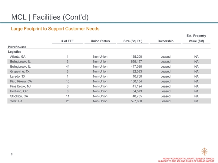 MCL | Facilities (Cont’d) Large Footprint to Support Customer Needs Est. Property # of FTE Union Status Size (Sq. Ft.) Ownership Value ($M) Warehouses Logistics Atlanta, GA 1 Non-Union 135,200 Leased NA Bolingbrook, IL 3 Non-Union 659,157 Leased NA Bolingbrook, IL 44 Non-Union 417,090 Leased NA Grapevine, TX 3 Non-Union 82,093 Leased NA Laredo, TX 1 Non-Union 10,750 Leased NA Pico Rivera, CA 10 Non-Union 160,154 Leased NA Pine Brook, NJ 8 Non-Union 41,194 Leased NA Portland, OR 8 Non-Union 54,573 Leased NA Stockton, CA 11 Non-Union 48,735 Leased NA York, PA 25 Non-Union 597,600 Leased NA 21 HIGHLY CONFIDENTIAL DRAFT, SUBJECT TO NDA; SUBJECT TO FRE 408 AND RULES OF SIMILAR IMPORTMCL | Facilities (Cont’d) Large Footprint to Support Customer Needs Est. Property # of FTE Union Status Size (Sq. Ft.) Ownership Value ($M) Warehouses Logistics Atlanta, GA 1 Non-Union 135,200 Leased NA Bolingbrook, IL 3 Non-Union 659,157 Leased NA Bolingbrook, IL 44 Non-Union 417,090 Leased NA Grapevine, TX 3 Non-Union 82,093 Leased NA Laredo, TX 1 Non-Union 10,750 Leased NA Pico Rivera, CA 10 Non-Union 160,154 Leased NA Pine Brook, NJ 8 Non-Union 41,194 Leased NA Portland, OR 8 Non-Union 54,573 Leased NA Stockton, CA 11 Non-Union 48,735 Leased NA York, PA 25 Non-Union 597,600 Leased NA 21 HIGHLY CONFIDENTIAL DRAFT, SUBJECT TO NDA; SUBJECT TO FRE 408 AND RULES OF SIMILAR IMPORT
