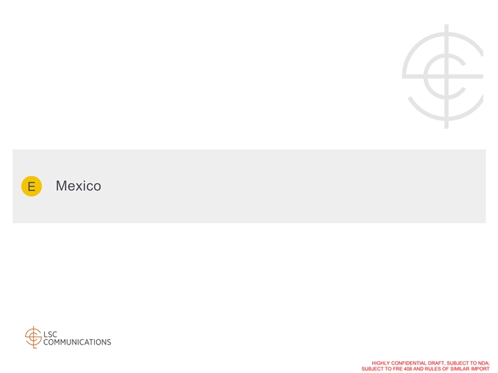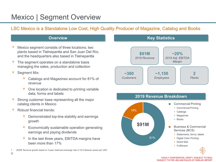 Mexico | Segment Overview LSC Mexico is a Standalone Low Cost, High Quality Producer of Magazine, Catalog and Books Overview Key Statistics + Mexico segment consists of three locations; two plants based in Tlalnepantla and San Juan Del Río, $91M ~20% and the headquarters also based in Tlalnepantla 2019 Revenue 2019 Adj. EBITDA Margin + The segment operates on a standalone basis managing the sales, production and collection + Segment Mix: ~380 ~1,150 2 Customers Employees Plants + Catalogs and Magazines account for 81% of revenue + One location is dedicated to printing variable data, forms and labels 2019 Revenue Breakdown + Strong customer base representing all the major ■ Commercial Printing catalog clients in Mexico + Commercial Printing + Robust financial trends: 19% + Catalogs + Magazines + Demonstrated top-line stability and earnings + Books growth $91M ■ Business & Commercial + Economically sustainable operation generating Services (BCS) earnings and paying dividends + Statements, forms, labels 81% + Digital Color Printing + In the last three years, EBITDA margins have + Direct Mail been more than 17% + Fulfillment 1. 2020E Revenue growth based on 3-year historical exchange rate of 19.5 Mexican pesos per USD 22 HIGHLY CONFIDENTIAL DRAFT, SUBJECT TO NDA; SUBJECT TO FRE 408 AND RULES OF SIMILAR IMPORTMexico | Segment Overview LSC Mexico is a Standalone Low Cost, High Quality Producer of Magazine, Catalog and Books Overview Key Statistics + Mexico segment consists of three locations; two plants based in Tlalnepantla and San Juan Del Río, $91M ~20% and the headquarters also based in Tlalnepantla 2019 Revenue 2019 Adj. EBITDA Margin + The segment operates on a standalone basis managing the sales, production and collection + Segment Mix: ~380 ~1,150 2 Customers Employees Plants + Catalogs and Magazines account for 81% of revenue + One location is dedicated to printing variable data, forms and labels 2019 Revenue Breakdown + Strong customer base representing all the major ■ Commercial Printing catalog clients in Mexico + Commercial Printing + Robust financial trends: 19% + Catalogs + Magazines + Demonstrated top-line stability and earnings + Books growth $91M ■ Business & Commercial + Economically sustainable operation generating Services (BCS) earnings and paying dividends + Statements, forms, labels 81% + Digital Color Printing + In the last three years, EBITDA margins have + Direct Mail been more than 17% + Fulfillment 1. 2020E Revenue growth based on 3-year historical exchange rate of 19.5 Mexican pesos per USD 22 HIGHLY CONFIDENTIAL DRAFT, SUBJECT TO NDA; SUBJECT TO FRE 408 AND RULES OF SIMILAR IMPORT