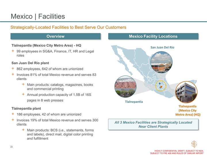 Mexico | Facilities Strategically-Located Facilities to Best Serve Our Customers Overview Mexico Facility Locations Tlalnepantla (Mexico City Metro Area) - HQ San Juan Del Río + 99 employees in SG&A, Finance, IT, HR and Legal roles San Juan Del Río plant + 862 employees, 642 of whom are unionized + Invoices 81% of total Mexico revenue and serves 83 clients + Main products: catalogs, magazines, books and commercial printing + Annual production capacity of 1.5B of 16S pages in 8 web presses Tlalnepantla Tlalnepantla Tlalnepantla plant (Mexico City + 186 employees, 42 of whom are unionized Metro Area) (HQ) + Invoices 19% of total Mexico revenue and serves 300 All 3 Mexico Facilities are Strategically Located clients Near Client Plants + Main products: BCS (i.e., statements, forms and labels), direct mail, digital color printing and fulfillment 23 HIGHLY CONFIDENTIAL DRAFT, SUBJECT TO NDA; SUBJECT TO FRE 408 AND RULES OF SIMILAR IMPORTMexico | Facilities Strategically-Located Facilities to Best Serve Our Customers Overview Mexico Facility Locations Tlalnepantla (Mexico City Metro Area) - HQ San Juan Del Río + 99 employees in SG&A, Finance, IT, HR and Legal roles San Juan Del Río plant + 862 employees, 642 of whom are unionized + Invoices 81% of total Mexico revenue and serves 83 clients + Main products: catalogs, magazines, books and commercial printing + Annual production capacity of 1.5B of 16S pages in 8 web presses Tlalnepantla Tlalnepantla Tlalnepantla plant (Mexico City + 186 employees, 42 of whom are unionized Metro Area) (HQ) + Invoices 19% of total Mexico revenue and serves 300 All 3 Mexico Facilities are Strategically Located clients Near Client Plants + Main products: BCS (i.e., statements, forms and labels), direct mail, digital color printing and fulfillment 23 HIGHLY CONFIDENTIAL DRAFT, SUBJECT TO NDA; SUBJECT TO FRE 408 AND RULES OF SIMILAR IMPORT