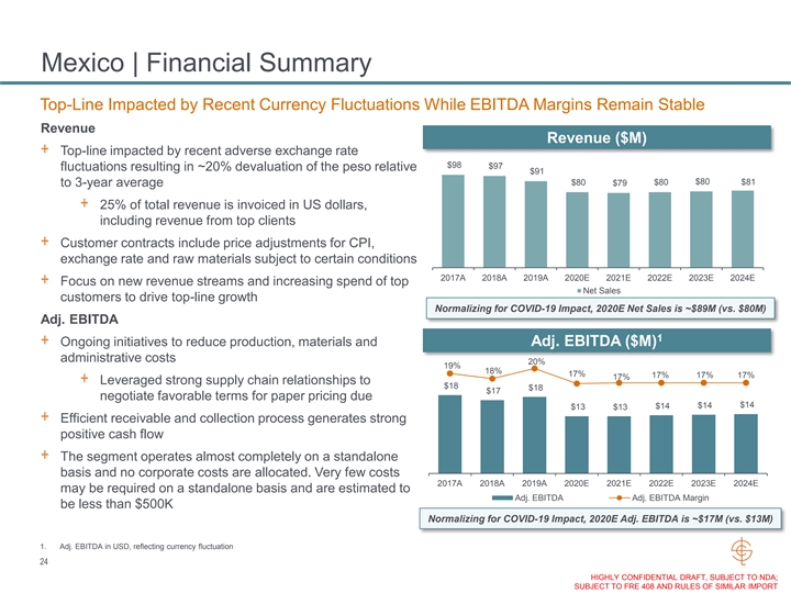 Mexico | Financial Summary Top-Line Impacted by Recent Currency Fluctuations While EBITDA Margins Remain Stable Revenue Revenue ($M) + Top-line impacted by recent adverse exchange rate $98 $97 fluctuations resulting in ~20% devaluation of the peso relative $91 $80 $81 $80 $79 $80 to 3-year average + 25% of total revenue is invoiced in US dollars, including revenue from top clients + Customer contracts include price adjustments for CPI, exchange rate and raw materials subject to certain conditions 2017A 2018A 2019A 2020E 2021E 2022E 2023E 2024E + Focus on new revenue streams and increasing spend of top Net Sales customers to drive top-line growth Normalizing for COVID-19 Impact, 2020E Net Sales is ~$89M (vs. $80M) Adj. EBITDA 1 + Ongoing initiatives to reduce production, materials and Adj. EBITDA ($M) administrative costs 20% 19% 18% 17% 17% 17% 17% 17% + Leveraged strong supply chain relationships to $18 $18 $17 negotiate favorable terms for paper pricing due $14 $14 $14 $13 $13 + Efficient receivable and collection process generates strong positive cash flow + The segment operates almost completely on a standalone basis and no corporate costs are allocated. Very few costs 2017A 2018A 2019A 2020E 2021E 2022E 2023E 2024E may be required on a standalone basis and are estimated to Adj. EBITDA Adj. EBITDA Margin be less than $500K Normalizing for COVID-19 Impact, 2020E Adj. EBITDA is ~$17M (vs. $13M) 1. Adj. EBITDA in USD, reflecting currency fluctuation 24 HIGHLY CONFIDENTIAL DRAFT, SUBJECT TO NDA; SUBJECT TO FRE 408 AND RULES OF SIMILAR IMPORTMexico | Financial Summary Top-Line Impacted by Recent Currency Fluctuations While EBITDA Margins Remain Stable Revenue Revenue ($M) + Top-line impacted by recent adverse exchange rate $98 $97 fluctuations resulting in ~20% devaluation of the peso relative $91 $80 $81 $80 $79 $80 to 3-year average + 25% of total revenue is invoiced in US dollars, including revenue from top clients + Customer contracts include price adjustments for CPI, exchange rate and raw materials subject to certain conditions 2017A 2018A 2019A 2020E 2021E 2022E 2023E 2024E + Focus on new revenue streams and increasing spend of top Net Sales customers to drive top-line growth Normalizing for COVID-19 Impact, 2020E Net Sales is ~$89M (vs. $80M) Adj. EBITDA 1 + Ongoing initiatives to reduce production, materials and Adj. EBITDA ($M) administrative costs 20% 19% 18% 17% 17% 17% 17% 17% + Leveraged strong supply chain relationships to $18 $18 $17 negotiate favorable terms for paper pricing due $14 $14 $14 $13 $13 + Efficient receivable and collection process generates strong positive cash flow + The segment operates almost completely on a standalone basis and no corporate costs are allocated. Very few costs 2017A 2018A 2019A 2020E 2021E 2022E 2023E 2024E may be required on a standalone basis and are estimated to Adj. EBITDA Adj. EBITDA Margin be less than $500K Normalizing for COVID-19 Impact, 2020E Adj. EBITDA is ~$17M (vs. $13M) 1. Adj. EBITDA in USD, reflecting currency fluctuation 24 HIGHLY CONFIDENTIAL DRAFT, SUBJECT TO NDA; SUBJECT TO FRE 408 AND RULES OF SIMILAR IMPORT