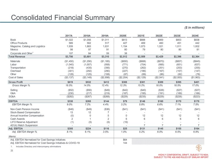Consolidated Financial Summary ($ in millions) 2017A 2018A 2019A 2020E 2021E 2022E 2023E 2024E Book $1,022 $1,056 $1,011 $813 $888 $869 $853 $838 Office Products 589 562 517 427 469 460 451 442 Magazine, Catalog and Logistics 1,939 1,883 1,631 1,154 1,073 1,021 1,011 1,002 Mexico 98 97 91 80 79 80 80 81 1 Corporate and Other 107 84 59 38 - - - - Total Revenue $3,756 $3,681 $3,310 $2,512 $2,509 $2,429 $2,396 $2,364 Materials ($1,450) ($1,290) ($1,185) ($850) ($888) ($870) ($857) ($845) Labor (1,040) (1,007) (958) (771) (704) (666) (651) (637) Transportation (218) (435) (356) (270) (262) (251) (253) (255) Overhead (301) (292) (290) (227) (186) (167) (157) (147) Other (128) (125) (108) (87) (89) (86) (82) (78) Cost of Sales ($3,137) ($3,149) ($2,898) ($2,204) ($2,129) ($2,041) ($2,000) ($1,963) Gross Profit $619 $532 $412 $308 $381 $389 $395 $401 Gross Margin % 16.5% 14.5% 12.4% 12.3% 15.2% 16.0% 16.5% 17.0% Selling ($52) ($50) ($49) ($42) ($40) ($38) ($37) ($37) G&A (230) (217) (219) (187) (195) (191) (189) (186) SG&A ($282) ($267) ($268) ($229) ($235) ($229) ($226) ($223) EBITDA $338 $265 $144 $79 $146 $160 $170 $178 EBITDA Margin % 9.0% 7.2% 4.4% 3.2% 5.8% 6.6% 7.1% 7.5% Non-Cash Pension Income ($46) ($49) ($36) ($41) ($41) ($41) ($41) ($41) Stock-Based Compensation 13 12 7 - - - - - Annual Incentive Compensation (0) 0 5 0 12 12 12 12 Cash Awards 2 1 2 6 6 6 6 6 LIFO Reserve Adjustment (1) (5) (6) (19) - - - - 401(k) Match Suspension - - - - 7 7 7 7 Adj. EBITDA $305 $224 $116 $25 $131 $145 $155 $164 Adj. EBITDA Margin % 8.1% 6.1% 3.5% 1.0% 5.2% 6.0% 6.5% 6.9% Memo: Adj. EBITDA Normalized for Cost Savings Initiatives $64 Adj. EBITDA Normalized for Cost Savings Initiatives & COVID-19 144 1. Includes Directory and intercompany eliminations 25 HIGHLY CONFIDENTIAL DRAFT, SUBJECT TO NDA; SUBJECT TO FRE 408 AND RULES OF SIMILAR IMPORTConsolidated Financial Summary ($ in millions) 2017A 2018A 2019A 2020E 2021E 2022E 2023E 2024E Book $1,022 $1,056 $1,011 $813 $888 $869 $853 $838 Office Products 589 562 517 427 469 460 451 442 Magazine, Catalog and Logistics 1,939 1,883 1,631 1,154 1,073 1,021 1,011 1,002 Mexico 98 97 91 80 79 80 80 81 1 Corporate and Other 107 84 59 38 - - - - Total Revenue $3,756 $3,681 $3,310 $2,512 $2,509 $2,429 $2,396 $2,364 Materials ($1,450) ($1,290) ($1,185) ($850) ($888) ($870) ($857) ($845) Labor (1,040) (1,007) (958) (771) (704) (666) (651) (637) Transportation (218) (435) (356) (270) (262) (251) (253) (255) Overhead (301) (292) (290) (227) (186) (167) (157) (147) Other (128) (125) (108) (87) (89) (86) (82) (78) Cost of Sales ($3,137) ($3,149) ($2,898) ($2,204) ($2,129) ($2,041) ($2,000) ($1,963) Gross Profit $619 $532 $412 $308 $381 $389 $395 $401 Gross Margin % 16.5% 14.5% 12.4% 12.3% 15.2% 16.0% 16.5% 17.0% Selling ($52) ($50) ($49) ($42) ($40) ($38) ($37) ($37) G&A (230) (217) (219) (187) (195) (191) (189) (186) SG&A ($282) ($267) ($268) ($229) ($235) ($229) ($226) ($223) EBITDA $338 $265 $144 $79 $146 $160 $170 $178 EBITDA Margin % 9.0% 7.2% 4.4% 3.2% 5.8% 6.6% 7.1% 7.5% Non-Cash Pension Income ($46) ($49) ($36) ($41) ($41) ($41) ($41) ($41) Stock-Based Compensation 13 12 7 - - - - - Annual Incentive Compensation (0) 0 5 0 12 12 12 12 Cash Awards 2 1 2 6 6 6 6 6 LIFO Reserve Adjustment (1) (5) (6) (19) - - - - 401(k) Match Suspension - - - - 7 7 7 7 Adj. EBITDA $305 $224 $116 $25 $131 $145 $155 $164 Adj. EBITDA Margin % 8.1% 6.1% 3.5% 1.0% 5.2% 6.0% 6.5% 6.9% Memo: Adj. EBITDA Normalized for Cost Savings Initiatives $64 Adj. EBITDA Normalized for Cost Savings Initiatives & COVID-19 144 1. Includes Directory and intercompany eliminations 25 HIGHLY CONFIDENTIAL DRAFT, SUBJECT TO NDA; SUBJECT TO FRE 408 AND RULES OF SIMILAR IMPORT