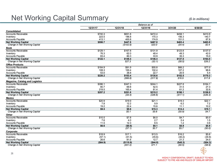 ($ in millions) Net Working Capital Summary Balance as of 12/31/17 12/31/18 12/31/19 3/31/20 6/30/20 Consolidated Accounts Receivable $740.3 $651.8 $472.4 $458.1 $410.9 Inventory 223.5 196.8 170.3 156.3 140.7 Accounts Payable 413.1 400.8 174.9 151.0 87.8 Net Working Capital $550.7 $447.8 $467.8 $463.4 $463.8 Change in Net Working Capital ($102.9) $20.0 ($4.4) $0.4 Book Accounts Receivable $129.1 $167.8 $131.9 $123.8 $137.0 Inventory 76.3 62.0 48.4 49.3 42.0 Accounts Payable 83.4 80.3 33.9 35.3 15.0 Net Working Capital $122.1 $149.4 $146.4 $137.8 $164.0 Change in Net Working Capital $27.3 ($3.1) ($8.5) $26.2 Office Products Accounts Receivable $164.9 $91.9 $55.8 $66.2 $77.0 Inventory 108.3 100.4 102.4 107.2 98.6 Accounts Payable 53.0 38.8 22.7 20.9 5.4 Net Working Capital $220.2 $153.4 $135.6 $152.5 $170.3 Change in Net Working Capital ($66.8) ($17.9) $16.9 $17.8 Magazine, Catalog and Logistics Accounts Receivable $396.1 $347.3 $244.1 $227.8 $164.1 Inventory 80.7 69.8 52.5 31.5 27.3 Accounts Payable 219.5 165.4 81.4 61.2 32.6 Net Working Capital $257.2 $251.8 $215.2 $198.1 $158.8 Change in Net Working Capital ($5.4) ($36.6) ($17.1) ($39.3) Mexico Accounts Receivable $20.9 $19.9 $21.1 $19.3 $22.1 Inventory 7.8 12.2 9.9 6.2 7.2 Accounts Payable 19.2 22.4 15.6 11.1 10.2 Net Working Capital $9.5 $9.6 $15.3 $14.4 $19.1 Change in Net Working Capital $0.1 $5.6 ($0.9) $4.7 Other Accounts Receivable $10.5 $7.8 $6.0 $4.7 $5.0 Inventory 7.6 4.0 2.7 2.4 1.5 Accounts Payable 11.5 12.3 8.5 1.2 0.6 Net Working Capital $6.6 ($0.6) $0.1 $5.9 $5.9 Change in Net Working Capital ($7.1) $0.7 $5.7 ($0.0) Corporate Accounts Receivable $18.9 $17.1 $13.5 $16.2 $5.6 Inventory (57.1) (51.5) (45.6) (40.2) (35.9) Accounts Payable 26.6 81.6 12.7 21.3 24.0 Net Working Capital ($64.9) ($115.9) ($44.8) ($45.3) ($54.3) Change in Net Working Capital ($51.0) $71.1 ($0.5) ($8.9) 26 HIGHLY CONFIDENTIAL DRAFT, SUBJECT TO NDA; SUBJECT TO FRE 408 AND RULES OF SIMILAR IMPORT($ in millions) Net Working Capital Summary Balance as of 12/31/17 12/31/18 12/31/19 3/31/20 6/30/20 Consolidated Accounts Receivable $740.3 $651.8 $472.4 $458.1 $410.9 Inventory 223.5 196.8 170.3 156.3 140.7 Accounts Payable 413.1 400.8 174.9 151.0 87.8 Net Working Capital $550.7 $447.8 $467.8 $463.4 $463.8 Change in Net Working Capital ($102.9) $20.0 ($4.4) $0.4 Book Accounts Receivable $129.1 $167.8 $131.9 $123.8 $137.0 Inventory 76.3 62.0 48.4 49.3 42.0 Accounts Payable 83.4 80.3 33.9 35.3 15.0 Net Working Capital $122.1 $149.4 $146.4 $137.8 $164.0 Change in Net Working Capital $27.3 ($3.1) ($8.5) $26.2 Office Products Accounts Receivable $164.9 $91.9 $55.8 $66.2 $77.0 Inventory 108.3 100.4 102.4 107.2 98.6 Accounts Payable 53.0 38.8 22.7 20.9 5.4 Net Working Capital $220.2 $153.4 $135.6 $152.5 $170.3 Change in Net Working Capital ($66.8) ($17.9) $16.9 $17.8 Magazine, Catalog and Logistics Accounts Receivable $396.1 $347.3 $244.1 $227.8 $164.1 Inventory 80.7 69.8 52.5 31.5 27.3 Accounts Payable 219.5 165.4 81.4 61.2 32.6 Net Working Capital $257.2 $251.8 $215.2 $198.1 $158.8 Change in Net Working Capital ($5.4) ($36.6) ($17.1) ($39.3) Mexico Accounts Receivable $20.9 $19.9 $21.1 $19.3 $22.1 Inventory 7.8 12.2 9.9 6.2 7.2 Accounts Payable 19.2 22.4 15.6 11.1 10.2 Net Working Capital $9.5 $9.6 $15.3 $14.4 $19.1 Change in Net Working Capital $0.1 $5.6 ($0.9) $4.7 Other Accounts Receivable $10.5 $7.8 $6.0 $4.7 $5.0 Inventory 7.6 4.0 2.7 2.4 1.5 Accounts Payable 11.5 12.3 8.5 1.2 0.6 Net Working Capital $6.6 ($0.6) $0.1 $5.9 $5.9 Change in Net Working Capital ($7.1) $0.7 $5.7 ($0.0) Corporate Accounts Receivable $18.9 $17.1 $13.5 $16.2 $5.6 Inventory (57.1) (51.5) (45.6) (40.2) (35.9) Accounts Payable 26.6 81.6 12.7 21.3 24.0 Net Working Capital ($64.9) ($115.9) ($44.8) ($45.3) ($54.3) Change in Net Working Capital ($51.0) $71.1 ($0.5) ($8.9) 26 HIGHLY CONFIDENTIAL DRAFT, SUBJECT TO NDA; SUBJECT TO FRE 408 AND RULES OF SIMILAR IMPORT
