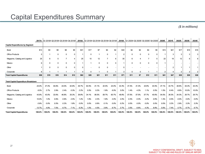 Capital Expenditures Summary ($ in millions) 2017A Q1 2018A Q2 2018A Q3 2018A Q4 2018A 2018A Q1 2019A Q2 2019A Q3 2019A Q4 2019A 2019A Q1 2020A Q2 2020E Q3 2020E Q4 2020E 2020E 2021E 2022E 2023E 2024E Capital Expenditures by Segment Book $13 $9 $9 $6 $6 $31 $17 $7 $4 $2 $30 $4 $2 $4 $5 $15 $21 $17 $16 $16 Office Products 5 1 0 0 0 1 0 1 0 1 2 0 0 0 0 1 3 3 3 3 Magazine, Catalog and Logistics 25 8 5 7 4 25 10 12 7 6 35 6 4 7 5 22 18 12 8 8 Mexico 6 0 0 0 0 1 1 0 0 0 1 0 0 0 0 1 - - - - Other 1 0 0 0 0 0 - 0 0 - 0 - - - - - 2 1 1 1 Corporate 8 1 1 1 1 4 0 1 0 1 3 0 0 1 1 2 4 2 2 2 Total Capital Expenditures $56 $19 $16 $14 $12 $62 $28 $21 $11 $11 $71 $11 $7 $12 $11 $41 $47 $35 $30 $30 Total Capital Expenditure Breakdown Book 23.0% 47.4% 55.9% 43.0% 52.9% 49.7% 62.5% 31.1% 32.5% 22.0% 42.3% 37.3% 31.3% 33.6% 44.5% 37.1% 44.7% 48.6% 53.3% 53.3% Office Products 8.5% 2.7% 2.9% 2.4% 0.3% 2.2% 0.5% 5.2% 1.9% 6.5% 3.0% 1.4% 4.3% 1.1% 0.5% 1.5% 6.4% 8.6% 10.0% 10.0% Magazine, Catalog and Logistics 43.9% 43.5% 32.6% 46.8% 35.3% 39.8% 34.1% 56.5% 59.7% 60.7% 48.8% 57.5% 57.5% 57.7% 45.6% 54.5% 38.3% 34.3% 26.7% 26.7% Mexico 10.0% 1.5% 0.9% 0.9% 2.5% 1.4% 1.9% 2.2% 1.9% 2.0% 2.0% 0.3% 0.3% 3.2% 0.6% 1.3% 0.0% 0.0% 0.0% 0.0% Other 0.9% 0.0% 0.5% 0.2% 1.8% 0.5% 0.0% 0.6% 0.1% 0.0% 0.2% 0.0% 0.0% 0.0% 0.0% 0.0% 3.2% 2.9% 3.3% 3.3% Corporate 13.7% 4.9% 7.0% 6.7% 7.1% 6.3% 1.0% 4.5% 3.9% 8.7% 3.7% 3.5% 6.6% 4.3% 8.8% 5.6% 7.4% 5.7% 6.7% 6.7% Total Capital Expenditures 100.0% 100.0% 100.0% 100.0% 100.0% 100.0% 100.0% 100.0% 100.0% 100.0% 100.0% 100.0% 100.0% 100.0% 100.0% 100.0% 100.0% 100.0% 100.0% 100.0% 27 HIGHLY CONFIDENTIAL DRAFT, SUBJECT TO NDA; SUBJECT TO FRE 408 AND RULES OF SIMILAR IMPORTCapital Expenditures Summary ($ in millions) 2017A Q1 2018A Q2 2018A Q3 2018A Q4 2018A 2018A Q1 2019A Q2 2019A Q3 2019A Q4 2019A 2019A Q1 2020A Q2 2020E Q3 2020E Q4 2020E 2020E 2021E 2022E 2023E 2024E Capital Expenditures by Segment Book $13 $9 $9 $6 $6 $31 $17 $7 $4 $2 $30 $4 $2 $4 $5 $15 $21 $17 $16 $16 Office Products 5 1 0 0 0 1 0 1 0 1 2 0 0 0 0 1 3 3 3 3 Magazine, Catalog and Logistics 25 8 5 7 4 25 10 12 7 6 35 6 4 7 5 22 18 12 8 8 Mexico 6 0 0 0 0 1 1 0 0 0 1 0 0 0 0 1 - - - - Other 1 0 0 0 0 0 - 0 0 - 0 - - - - - 2 1 1 1 Corporate 8 1 1 1 1 4 0 1 0 1 3 0 0 1 1 2 4 2 2 2 Total Capital Expenditures $56 $19 $16 $14 $12 $62 $28 $21 $11 $11 $71 $11 $7 $12 $11 $41 $47 $35 $30 $30 Total Capital Expenditure Breakdown Book 23.0% 47.4% 55.9% 43.0% 52.9% 49.7% 62.5% 31.1% 32.5% 22.0% 42.3% 37.3% 31.3% 33.6% 44.5% 37.1% 44.7% 48.6% 53.3% 53.3% Office Products 8.5% 2.7% 2.9% 2.4% 0.3% 2.2% 0.5% 5.2% 1.9% 6.5% 3.0% 1.4% 4.3% 1.1% 0.5% 1.5% 6.4% 8.6% 10.0% 10.0% Magazine, Catalog and Logistics 43.9% 43.5% 32.6% 46.8% 35.3% 39.8% 34.1% 56.5% 59.7% 60.7% 48.8% 57.5% 57.5% 57.7% 45.6% 54.5% 38.3% 34.3% 26.7% 26.7% Mexico 10.0% 1.5% 0.9% 0.9% 2.5% 1.4% 1.9% 2.2% 1.9% 2.0% 2.0% 0.3% 0.3% 3.2% 0.6% 1.3% 0.0% 0.0% 0.0% 0.0% Other 0.9% 0.0% 0.5% 0.2% 1.8% 0.5% 0.0% 0.6% 0.1% 0.0% 0.2% 0.0% 0.0% 0.0% 0.0% 0.0% 3.2% 2.9% 3.3% 3.3% Corporate 13.7% 4.9% 7.0% 6.7% 7.1% 6.3% 1.0% 4.5% 3.9% 8.7% 3.7% 3.5% 6.6% 4.3% 8.8% 5.6% 7.4% 5.7% 6.7% 6.7% Total Capital Expenditures 100.0% 100.0% 100.0% 100.0% 100.0% 100.0% 100.0% 100.0% 100.0% 100.0% 100.0% 100.0% 100.0% 100.0% 100.0% 100.0% 100.0% 100.0% 100.0% 100.0% 27 HIGHLY CONFIDENTIAL DRAFT, SUBJECT TO NDA; SUBJECT TO FRE 408 AND RULES OF SIMILAR IMPORT