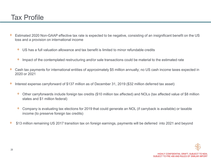 Tax Profile + Estimated 2020 Non-GAAP effective tax rate is expected to be negative, consisting of an insignificant benefit on the US loss and a provision on international income + US has a full valuation allowance and tax benefit is limited to minor refundable credits + Impact of the contemplated restructuring and/or sale transactions could be material to the estimated rate + Cash tax payments for international entities of approximately $5 million annually; no US cash income taxes expected in 2020 or 2021 + Interest expense carryforward of $137 million as of December 31, 2019 ($32 million deferred tax asset) + Other carryforwards include foreign tax credits ($10 million tax affected) and NOLs (tax affected value of $8 million states and $1 million federal) + Company is evaluating tax elections for 2019 that could generate an NOL (if carryback is available) or taxable income (to preserve foreign tax credits) + $13 million remaining US 2017 transition tax on foreign earnings, payments will be deferred into 2021 and beyond 28 HIGHLY CONFIDENTIAL DRAFT, SUBJECT TO NDA; SUBJECT TO FRE 408 AND RULES OF SIMILAR IMPORTTax Profile + Estimated 2020 Non-GAAP effective tax rate is expected to be negative, consisting of an insignificant benefit on the US loss and a provision on international income + US has a full valuation allowance and tax benefit is limited to minor refundable credits + Impact of the contemplated restructuring and/or sale transactions could be material to the estimated rate + Cash tax payments for international entities of approximately $5 million annually; no US cash income taxes expected in 2020 or 2021 + Interest expense carryforward of $137 million as of December 31, 2019 ($32 million deferred tax asset) + Other carryforwards include foreign tax credits ($10 million tax affected) and NOLs (tax affected value of $8 million states and $1 million federal) + Company is evaluating tax elections for 2019 that could generate an NOL (if carryback is available) or taxable income (to preserve foreign tax credits) + $13 million remaining US 2017 transition tax on foreign earnings, payments will be deferred into 2021 and beyond 28 HIGHLY CONFIDENTIAL DRAFT, SUBJECT TO NDA; SUBJECT TO FRE 408 AND RULES OF SIMILAR IMPORT