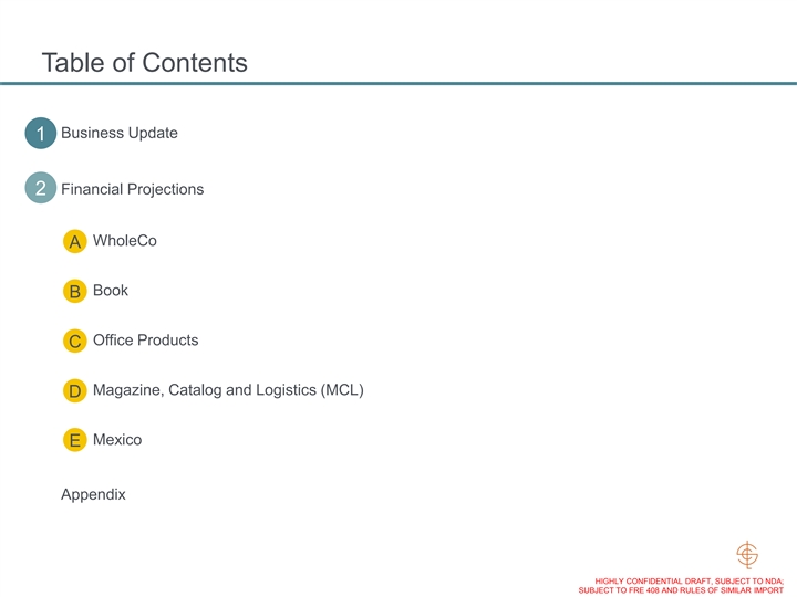 Table of Contents + Business Update 1 + Financial Projections 2 + WholeCo A + Book B + Office Products C + Magazine, Catalog and Logistics (MCL) D + Mexico E + Appendix 3 HIGHLY CONFIDENTIAL DRAFT, SUBJECT TO NDA; SUBJECT TO FRE 408 AND RULES OF SIMILAR IMPORTTable of Contents + Business Update 1 + Financial Projections 2 + WholeCo A + Book B + Office Products C + Magazine, Catalog and Logistics (MCL) D + Mexico E + Appendix 3 HIGHLY CONFIDENTIAL DRAFT, SUBJECT TO NDA; SUBJECT TO FRE 408 AND RULES OF SIMILAR IMPORT