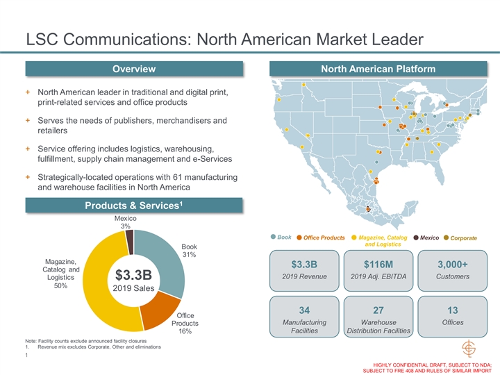 LSC Communications: North American Market Leader Overview North American Platform + North American leader in traditional and digital print, print-related services and office products + Serves the needs of publishers, merchandisers and retailers + Service offering includes logistics, warehousing, fulfillment, supply chain management and e-Services + Strategically-located operations with 61 manufacturing and warehouse facilities in North America 1 Products & Services Mexico 3% F:\Word Processing\MapInf o\MapInf o Jobs\Leonard, Cole\04-09-20 Book Office Products Magazine, Catalog Mexico Corporate and Logistics Book 31% Magazine, $3.3B $116M 3,000+ Catalog and 2019 Revenue 2019 Adj. EBITDA Customers Logistics $3.3B 50% 2019 Sales 34 27 13 Office Manufacturing Warehouse Offices Products 16% Facilities Distribution Facilities Note: Facility counts exclude announced facility closures 1. Revenue mix excludes Corporate, Other and eliminations 1 HIGHLY CONFIDENTIAL DRAFT, SUBJECT TO NDA; SUBJECT TO FRE 408 AND RULES OF SIMILAR IMPORTLSC Communications: North American Market Leader Overview North American Platform + North American leader in traditional and digital print, print-related services and office products + Serves the needs of publishers, merchandisers and retailers + Service offering includes logistics, warehousing, fulfillment, supply chain management and e-Services + Strategically-located operations with 61 manufacturing and warehouse facilities in North America 1 Products & Services Mexico 3% F:\Word Processing\MapInf o\MapInf o Jobs\Leonard, Cole\04-09-20 Book Office Products Magazine, Catalog Mexico Corporate and Logistics Book 31% Magazine, $3.3B $116M 3,000+ Catalog and 2019 Revenue 2019 Adj. EBITDA Customers Logistics $3.3B 50% 2019 Sales 34 27 13 Office Manufacturing Warehouse Offices Products 16% Facilities Distribution Facilities Note: Facility counts exclude announced facility closures 1. Revenue mix excludes Corporate, Other and eliminations 1 HIGHLY CONFIDENTIAL DRAFT, SUBJECT TO NDA; SUBJECT TO FRE 408 AND RULES OF SIMILAR IMPORT