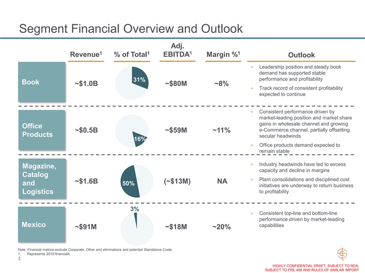 Segment Financial Overview and Outlook Adj. 1 1 1 1 EBITDA Revenue % of Total Margin % Outlook + Leadership position and steady book demand has supported stable performance and profitability 31% Book ~$1.0B ~$80M ~8% + Track record of consistent profitability expected to continue + Consistent performance driven by market-leading position and market share gains in wholesale channel and growing Office e-Commerce channel, partially offsetting ~$0.5B ~$59M ~11% Products secular headwinds 16% + Office products demand expected to remain stable + Industry headwinds have led to excess Magazine, capacity and decline in margins Catalog + Plant consolidations and disciplined cost ~$1.6B (~$13M) NA and 50% initiatives are underway to return business to profitability Logistics 3% + Consistent top-line and bottom-line performance driven by market-leading Mexico capabilities ~$91M ~$18M ~20% Note: Financial metrics exclude Corporate, Other and eliminations and potential Standalone Costs 1. Represents 2019 financials 2 HIGHLY CONFIDENTIAL DRAFT, SUBJECT TO NDA; SUBJECT TO FRE 408 AND RULES OF SIMILAR IMPORTSegment Financial Overview and Outlook Adj. 1 1 1 1 EBITDA Revenue % of Total Margin % Outlook + Leadership position and steady book demand has supported stable performance and profitability 31% Book ~$1.0B ~$80M ~8% + Track record of consistent profitability expected to continue + Consistent performance driven by market-leading position and market share gains in wholesale channel and growing Office e-Commerce channel, partially offsetting ~$0.5B ~$59M ~11% Products secular headwinds 16% + Office products demand expected to remain stable + Industry headwinds have led to excess Magazine, capacity and decline in margins Catalog + Plant consolidations and disciplined cost ~$1.6B (~$13M) NA and 50% initiatives are underway to return business to profitability Logistics 3% + Consistent top-line and bottom-line performance driven by market-leading Mexico capabilities ~$91M ~$18M ~20% Note: Financial metrics exclude Corporate, Other and eliminations and potential Standalone Costs 1. Represents 2019 financials 2 HIGHLY CONFIDENTIAL DRAFT, SUBJECT TO NDA; SUBJECT TO FRE 408 AND RULES OF SIMILAR IMPORT