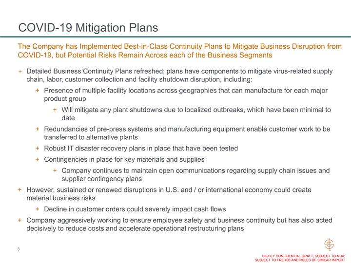 COVID-19 Mitigation Plans The Company has Implemented Best-in-Class Continuity Plans to Mitigate Business Disruption from COVID-19, but Potential Risks Remain Across each of the Business Segments + Detailed Business Continuity Plans refreshed; plans have components to mitigate virus-related supply chain, labor, customer collection and facility shutdown disruption, including: + Presence of multiple facility locations across geographies that can manufacture for each major product group + Will mitigate any plant shutdowns due to localized outbreaks, which have been minimal to date + Redundancies of pre-press systems and manufacturing equipment enable customer work to be transferred to alternative plants + Robust IT disaster recovery plans in place that have been tested + Contingencies in place for key materials and supplies + Company continues to maintain open communications regarding supply chain issues and supplier contingency plans + However, sustained or renewed disruptions in U.S. and / or international economy could create material business risks + Decline in customer orders could severely impact cash flows + Company aggressively working to ensure employee safety and business continuity but has also acted decisively to reduce costs and accelerate operational restructuring plans 3 HIGHLY CONFIDENTIAL DRAFT, SUBJECT TO NDA; SUBJECT TO FRE 408 AND RULES OF SIMILAR IMPORTCOVID-19 Mitigation Plans The Company has Implemented Best-in-Class Continuity Plans to Mitigate Business Disruption from COVID-19, but Potential Risks Remain Across each of the Business Segments + Detailed Business Continuity Plans refreshed; plans have components to mitigate virus-related supply chain, labor, customer collection and facility shutdown disruption, including: + Presence of multiple facility locations across geographies that can manufacture for each major product group + Will mitigate any plant shutdowns due to localized outbreaks, which have been minimal to date + Redundancies of pre-press systems and manufacturing equipment enable customer work to be transferred to alternative plants + Robust IT disaster recovery plans in place that have been tested + Contingencies in place for key materials and supplies + Company continues to maintain open communications regarding supply chain issues and supplier contingency plans + However, sustained or renewed disruptions in U.S. and / or international economy could create material business risks + Decline in customer orders could severely impact cash flows + Company aggressively working to ensure employee safety and business continuity but has also acted decisively to reduce costs and accelerate operational restructuring plans 3 HIGHLY CONFIDENTIAL DRAFT, SUBJECT TO NDA; SUBJECT TO FRE 408 AND RULES OF SIMILAR IMPORT
