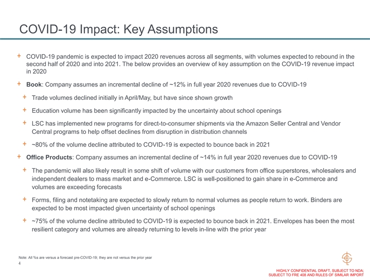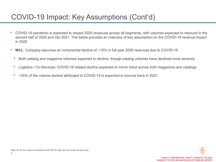 COVID-19 Impact: Key Assumptions + COVID-19 pandemic is expected to impact 2020 revenues across all segments, with volumes expected to rebound in the second half of 2020 and into 2021. The below provides an overview of key assumption on the COVID-19 revenue impact in 2020 + Book: Company assumes an incremental decline of ~12% in full year 2020 revenues due to COVID-19 + Trade volumes declined initially in April/May, but have since shown growth + Education volume has been significantly impacted by the uncertainty about school openings + LSC has implemented new programs for direct-to-consumer shipments via the Amazon Seller Central and Vendor Central programs to help offset declines from disruption in distribution channels + ~80% of the volume decline attributed to COVID-19 is expected to bounce back in 2021 + Office Products: Company assumes an incremental decline of ~14% in full year 2020 revenues due to COVID-19 + The pandemic will also likely result in some shift of volume with our customers from office superstores, wholesalers and independent dealers to mass market and e-Commerce. LSC is well-positioned to gain share in e-Commerce and volumes are exceeding forecasts + Forms, filing and notetaking are expected to slowly return to normal volumes as people return to work. Binders are expected to be most impacted given uncertainty of school openings + ~75% of the volume decline attributed to COVID-19 is expected to bounce back in 2021. Envelopes has been the most resilient category and volumes are already returning to levels in-line with the prior year Note: All %s are versus a forecast pre-COVID-19; they are not versus the prior year 4 HIGHLY CONFIDENTIAL DRAFT, SUBJECT TO NDA; SUBJECT TO FRE 408 AND RULES OF SIMILAR IMPORTCOVID-19 Impact: Key Assumptions + COVID-19 pandemic is expected to impact 2020 revenues across all segments, with volumes expected to rebound in the second half of 2020 and into 2021. The below provides an overview of key assumption on the COVID-19 revenue impact in 2020 + Book: Company assumes an incremental decline of ~12% in full year 2020 revenues due to COVID-19 + Trade volumes declined initially in April/May, but have since shown growth + Education volume has been significantly impacted by the uncertainty about school openings + LSC has implemented new programs for direct-to-consumer shipments via the Amazon Seller Central and Vendor Central programs to help offset declines from disruption in distribution channels + ~80% of the volume decline attributed to COVID-19 is expected to bounce back in 2021 + Office Products: Company assumes an incremental decline of ~14% in full year 2020 revenues due to COVID-19 + The pandemic will also likely result in some shift of volume with our customers from office superstores, wholesalers and independent dealers to mass market and e-Commerce. LSC is well-positioned to gain share in e-Commerce and volumes are exceeding forecasts + Forms, filing and notetaking are expected to slowly return to normal volumes as people return to work. Binders are expected to be most impacted given uncertainty of school openings + ~75% of the volume decline attributed to COVID-19 is expected to bounce back in 2021. Envelopes has been the most resilient category and volumes are already returning to levels in-line with the prior year Note: All %s are versus a forecast pre-COVID-19; they are not versus the prior year 4 HIGHLY CONFIDENTIAL DRAFT, SUBJECT TO NDA; SUBJECT TO FRE 408 AND RULES OF SIMILAR IMPORT