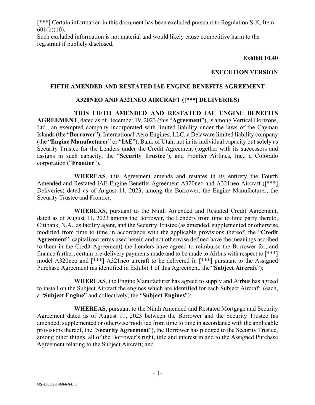 [***] Certain information in this document has been excluded pursuant to Regulation S-K, Item 601(b)(10). Such excluded information is not material and would likely cause competitive harm to the registrant if publicly disclosed. Exhibit 10.40 EXECUTION VERSION - 1- US-DOCS\146846845.3 FIFTH AMENDED AND RESTATED IAE ENGINE BENEFITS AGREEMENT A320NEO AND A321NEO AIRCRAFT ([***] DELIVERIES) THIS FIFTH AMENDED AND RESTATED IAE ENGINE BENEFITS AGREEMENT, dated as of December 19, 2023 (this “Agreement”), is among Vertical Horizons, Ltd., an exempted company incorporated with limited liability under the laws of the Cayman Islands (the “Borrower”), International Aero Engines, LLC, a Delaware limited liability company (the “Engine Manufacturer” or “IAE”), Bank of Utah, not in its individual capacity but solely as Security Trustee for the Lenders under the Credit Agreement (together with its successors and assigns in such capacity, the “Security Trustee”), and Frontier Airlines, Inc., a Colorado corporation (“Frontier”). WHEREAS, this Agreement amends and restates in its entirety the Fourth Amended and Restated IAE Engine Benefits Agreement A320neo and A321neo Aircraft ([***] Deliveries) dated as of August 11, 2023, among the Borrower, the Engine Manufacturer, the Security Trustee and Frontier; WHEREAS, pursuant to the Ninth Amended and Restated Credit Agreement, dated as of August 11, 2023 among the Borrower, the Lenders from time to time party thereto, Citibank, N.A., as facility agent, and the Security Trustee (as amended, supplemented or otherwise modified from time to time in accordance with the applicable provisions thereof, the “Credit Agreement”; capitalized terms used herein and not otherwise defined have the meanings ascribed to them in the Credit Agreement) the Lenders have agreed to reimburse the Borrower for, and finance further, certain pre-delivery payments made and to be made to Airbus with respect to [***] model A320neo and [***] A321neo aircraft to be delivered in [***] pursuant to the Assigned Purchase Agreement (as identified in Exhibit 1 of this Agreement, the “Subject Aircraft”); WHEREAS, the Engine Manufacturer has agreed to supply and Airbus has agreed to install on the Subject Aircraft the engines which are identified for each Subject Aircraft (each, a “Subject Engine” and collectively, the “Subject Engines”); WHEREAS, pursuant to the Ninth Amended and Restated Mortgage and Security Agreement dated as of August 11, 2023 between the Borrower and the Security Trustee (as amended, supplemented or otherwise modified from time to time in accordance with the applicable provisions thereof, the “Security Agreement”), the Borrower has pledged to the Security Trustee, among other things, all of the Borrower’s right, title and interest in and to the Assigned Purchase Agreement relating to the Subject Aircraft; and