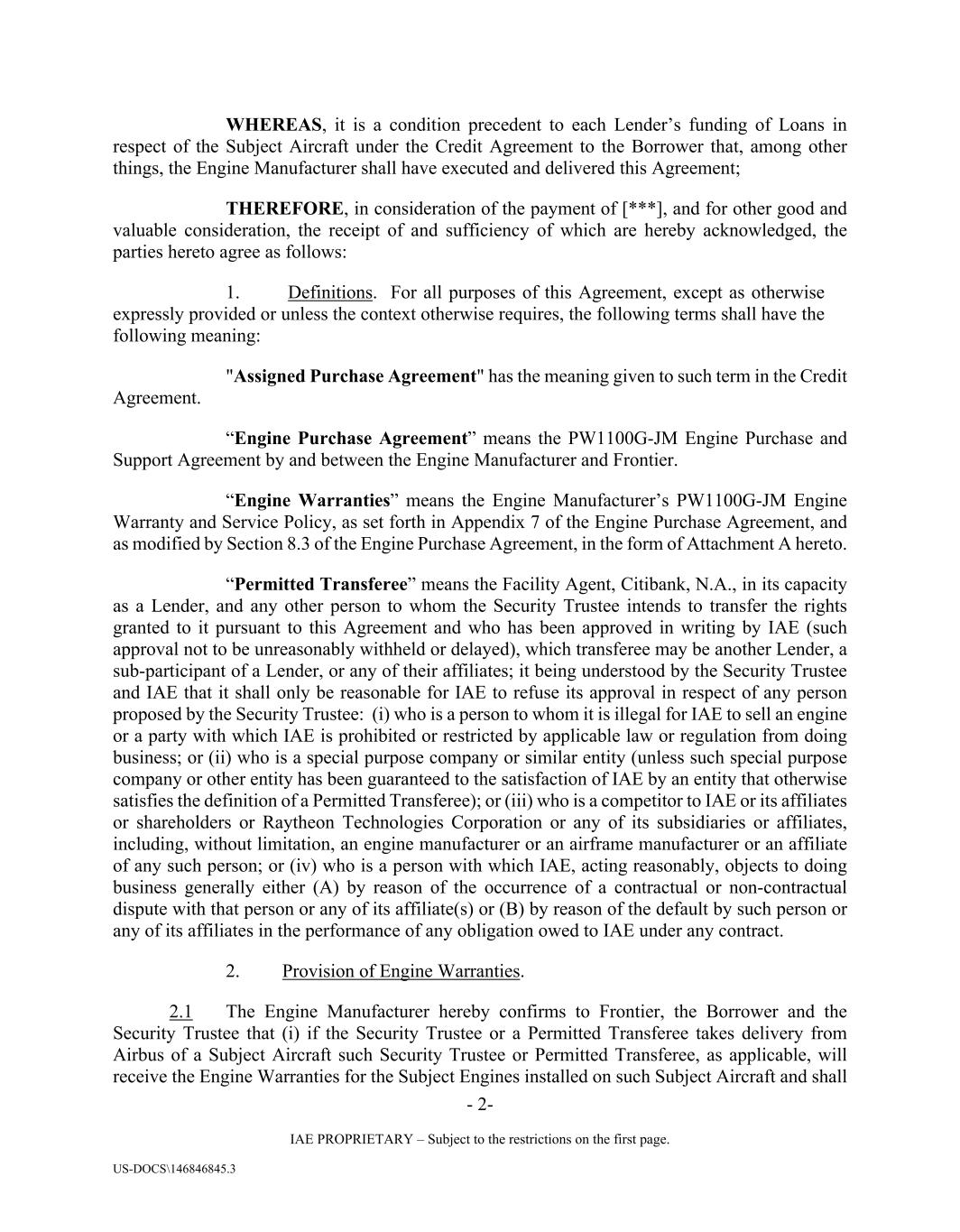 - 2- IAE PROPRIETARY – Subject to the restrictions on the first page. US-DOCS\146846845.3 WHEREAS, it is a condition precedent to each Lender’s funding of Loans in respect of the Subject Aircraft under the Credit Agreement to the Borrower that, among other things, the Engine Manufacturer shall have executed and delivered this Agreement; THEREFORE, in consideration of the payment of [***], and for other good and valuable consideration, the receipt of and sufficiency of which are hereby acknowledged, the parties hereto agree as follows: 1. Definitions. For all purposes of this Agreement, except as otherwise expressly provided or unless the context otherwise requires, the following terms shall have the following meaning: "Assigned Purchase Agreement" has the meaning given to such term in the Credit Agreement. “Engine Purchase Agreement” means the PW1100G-JM Engine Purchase and Support Agreement by and between the Engine Manufacturer and Frontier. “Engine Warranties” means the Engine Manufacturer’s PW1100G-JM Engine Warranty and Service Policy, as set forth in Appendix 7 of the Engine Purchase Agreement, and as modified by Section 8.3 of the Engine Purchase Agreement, in the form of Attachment A hereto. “Permitted Transferee” means the Facility Agent, Citibank, N.A., in its capacity as a Lender, and any other person to whom the Security Trustee intends to transfer the rights granted to it pursuant to this Agreement and who has been approved in writing by IAE (such approval not to be unreasonably withheld or delayed), which transferee may be another Lender, a sub-participant of a Lender, or any of their affiliates; it being understood by the Security Trustee and IAE that it shall only be reasonable for IAE to refuse its approval in respect of any person proposed by the Security Trustee: (i) who is a person to whom it is illegal for IAE to sell an engine or a party with which IAE is prohibited or restricted by applicable law or regulation from doing business; or (ii) who is a special purpose company or similar entity (unless such special purpose company or other entity has been guaranteed to the satisfaction of IAE by an entity that otherwise satisfies the definition of a Permitted Transferee); or (iii) who is a competitor to IAE or its affiliates or shareholders or Raytheon Technologies Corporation or any of its subsidiaries or affiliates, including, without limitation, an engine manufacturer or an airframe manufacturer or an affiliate of any such person; or (iv) who is a person with which IAE, acting reasonably, objects to doing business generally either (A) by reason of the occurrence of a contractual or non-contractual dispute with that person or any of its affiliate(s) or (B) by reason of the default by such person or any of its affiliates in the performance of any obligation owed to IAE under any contract. 2. Provision of Engine Warranties. 2.1 The Engine Manufacturer hereby confirms to Frontier, the Borrower and the Security Trustee that (i) if the Security Trustee or a Permitted Transferee takes delivery from Airbus of a Subject Aircraft such Security Trustee or Permitted Transferee, as applicable, will receive the Engine Warranties for the Subject Engines installed on such Subject Aircraft and shall
